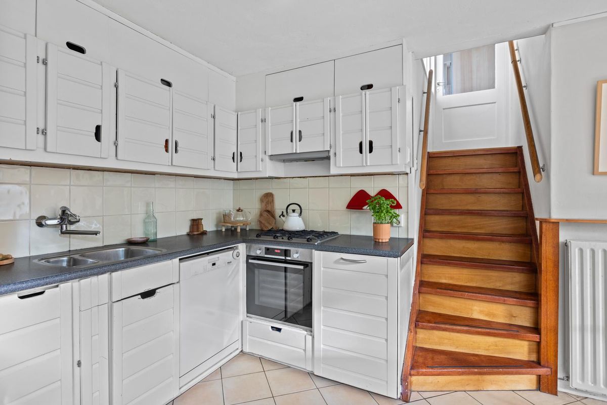 Je komt binnen in de hal, waar je de originele tegels terugziet. De hal brengt je naar de keuken, aan de achterzijde van de woning. De keuken is in het verleden door de bewoner zelf gebouwd en beschikt vandaag de dag nog steeds over alle apparatuur voor het koken van de lekkerste maaltijden. Denk daarbij aan een gaskookplaat, oven en een vaatwasser. In de compacte ‘bij’ keuken vind je de koelkast, vriezer en een aansluiting voor de wasmachine.