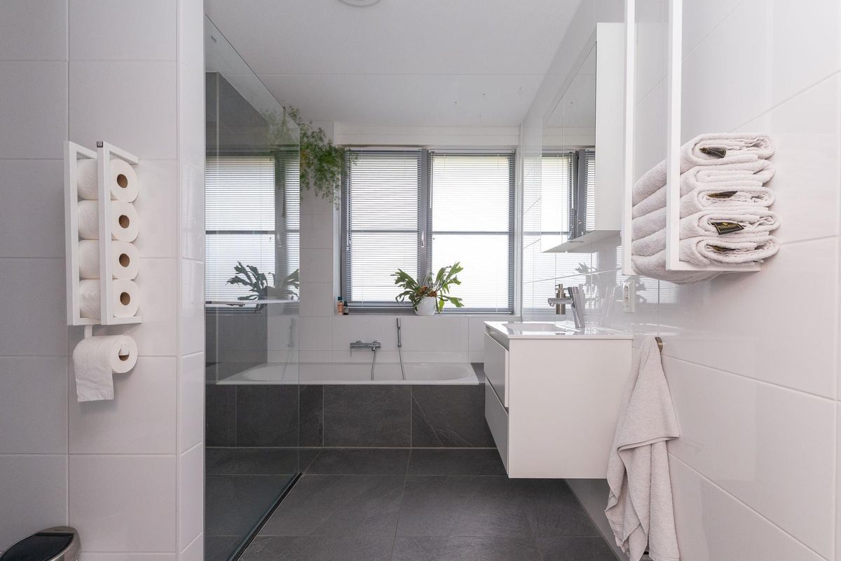 De luxe en fraai afgewerkte badkamer is een echte wellness-oase met een inloopdouche, een ligbad, een stijlvol badkamermeubel en een modern toilet. Voor extra comfort is de gehele verdieping voorzien van vloerverwarming, wat zorgt voor een aangename warmte, zelfs op koude dagen.