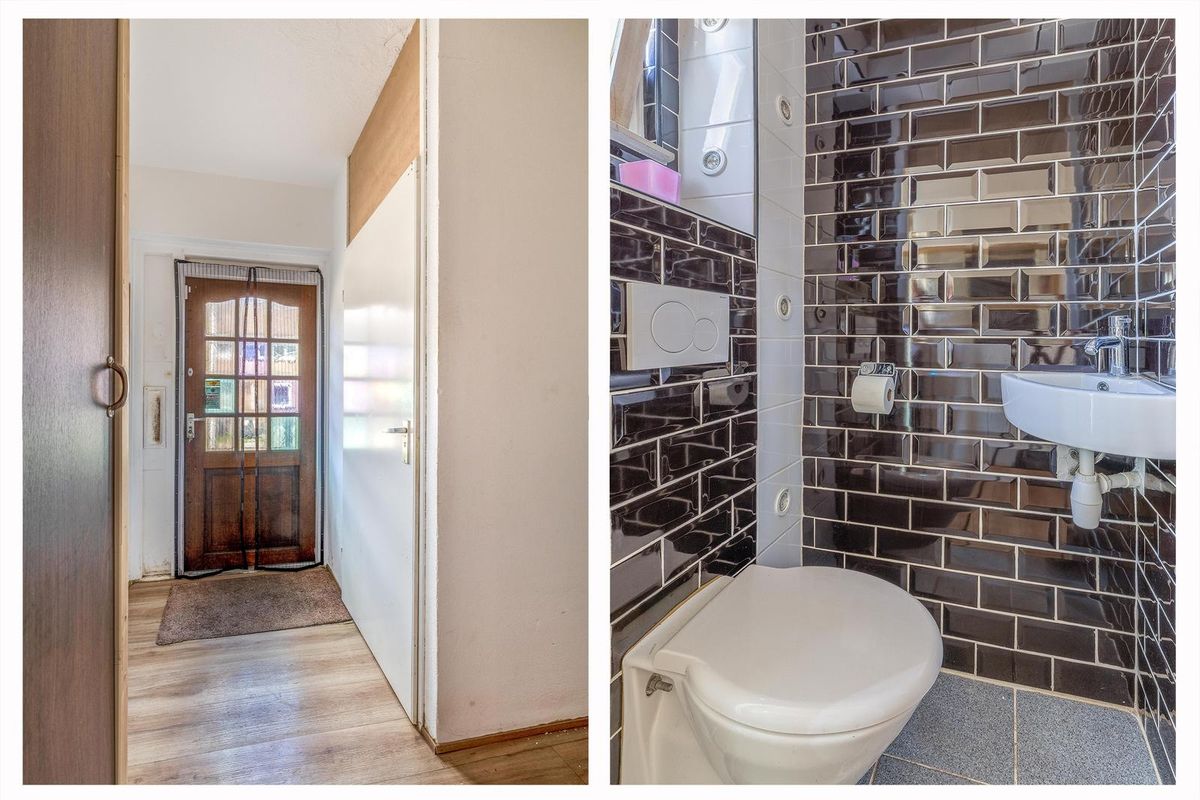 Bij binnenkomst komt u in de hal, voorzien van een nette laminaatvloer die doorloopt over de gehele begane grond. In de hal bevinden zich de meterkast, een separaat toilet met fonteintje, de trapopgang naar de eerste verdieping en de toegang tot het leefgedeelte.