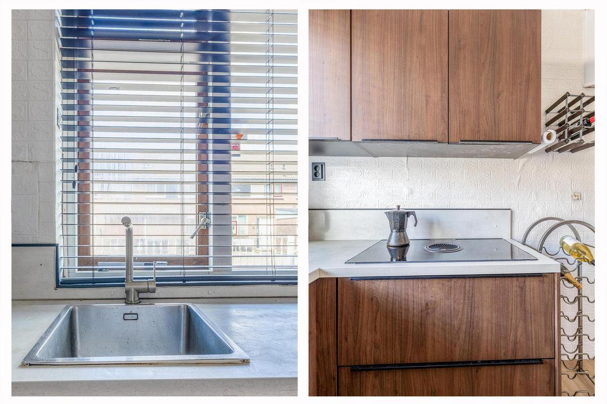 De halfopen keuken (2022) heeft een warme, houten uitstraling en is voorzien van moderne inbouwapparatuur, waaronder een inductiekookplaat met geïntegreerde afzuiging, een combimagnetron, vaatwasser en koelkast.