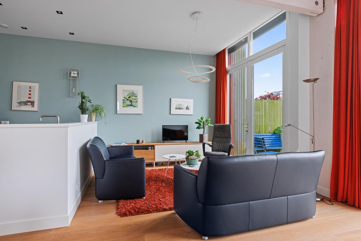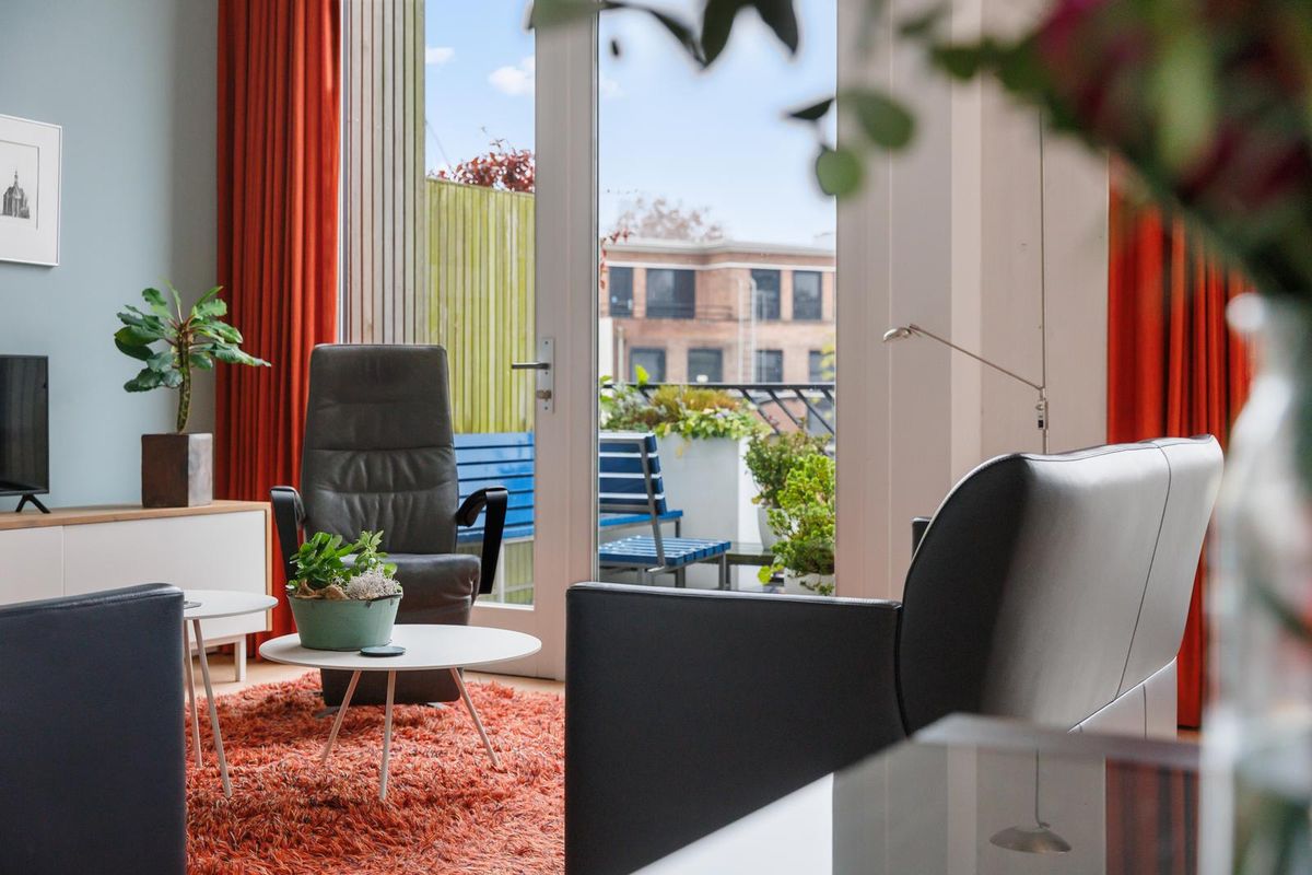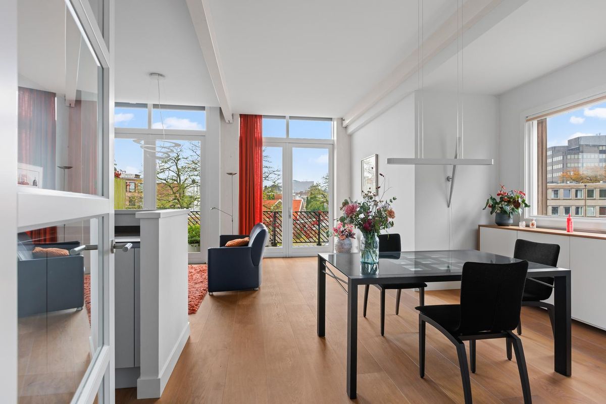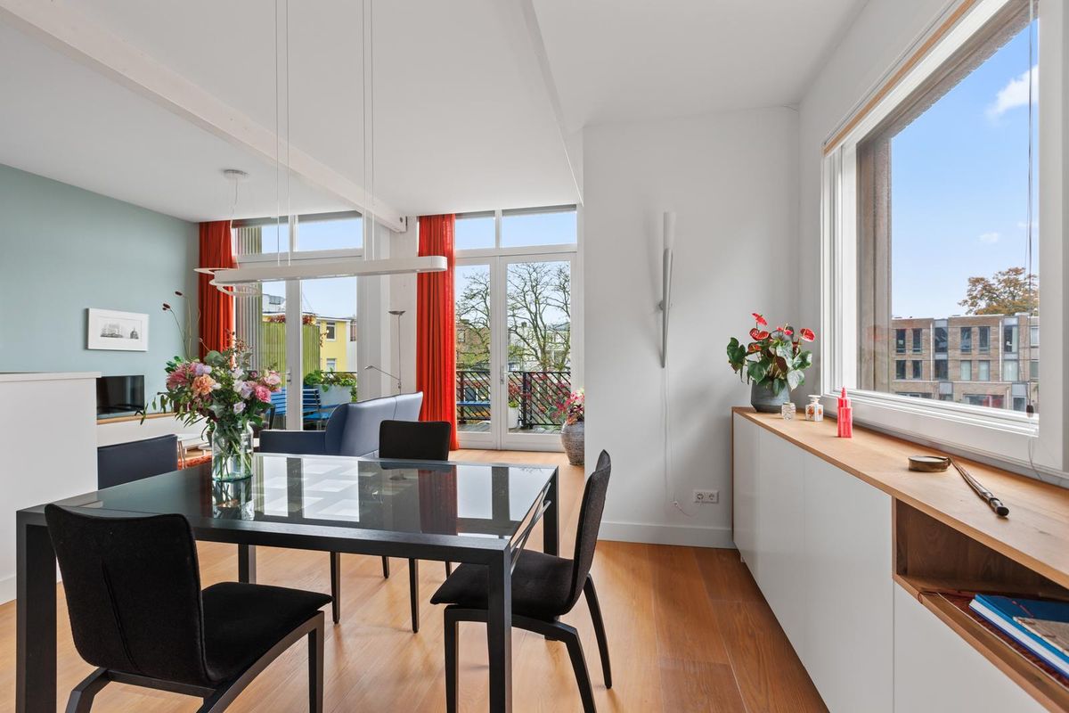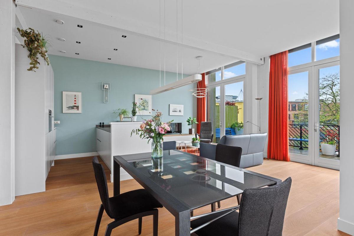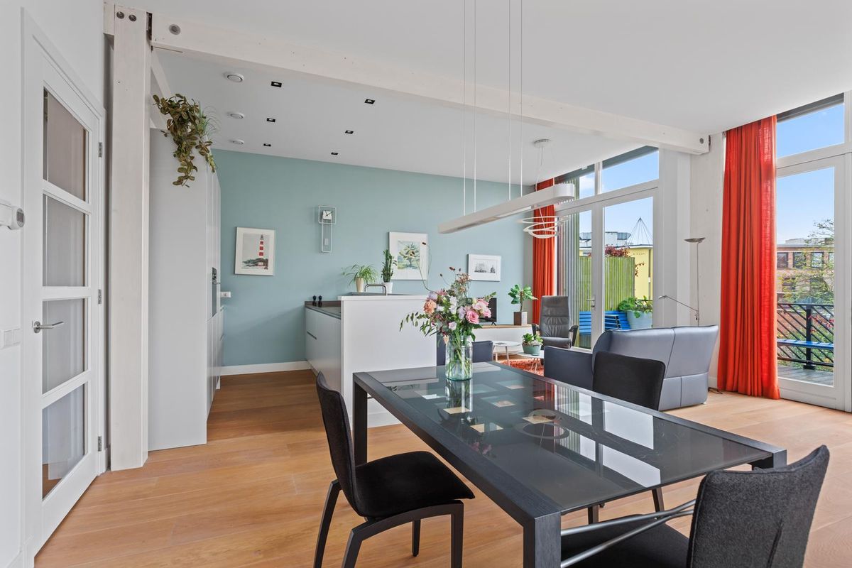 De zithoek ligt centraal tussen de keuken en het terras aan de achterzijde, waardoor dit een heerlijke plek is om te ontspannen. Via het zijraam is er zelfs zicht op de Onze-Lieve-Vrouwe-Toren. De open keuken heeft een parallelle opstelling met twee blokken: een hoge kastenwand met veel opbergruimte, een koel/vriescombinatie en een combi oven, en een halfhoog werkblok met vaatwasser en inductiekookplaat met geïntegreerde afzuiging. In de hoek maakt een gezellig nisje het plaatje af, perfect voor je koffiemachine. De quooker zorgt voor extra luxe. Rechts van de keuken vind je het ruime eetgedeelte, waar je met gemak een grote tafel kwijt kunt voor lange diners met vrienden of familie.