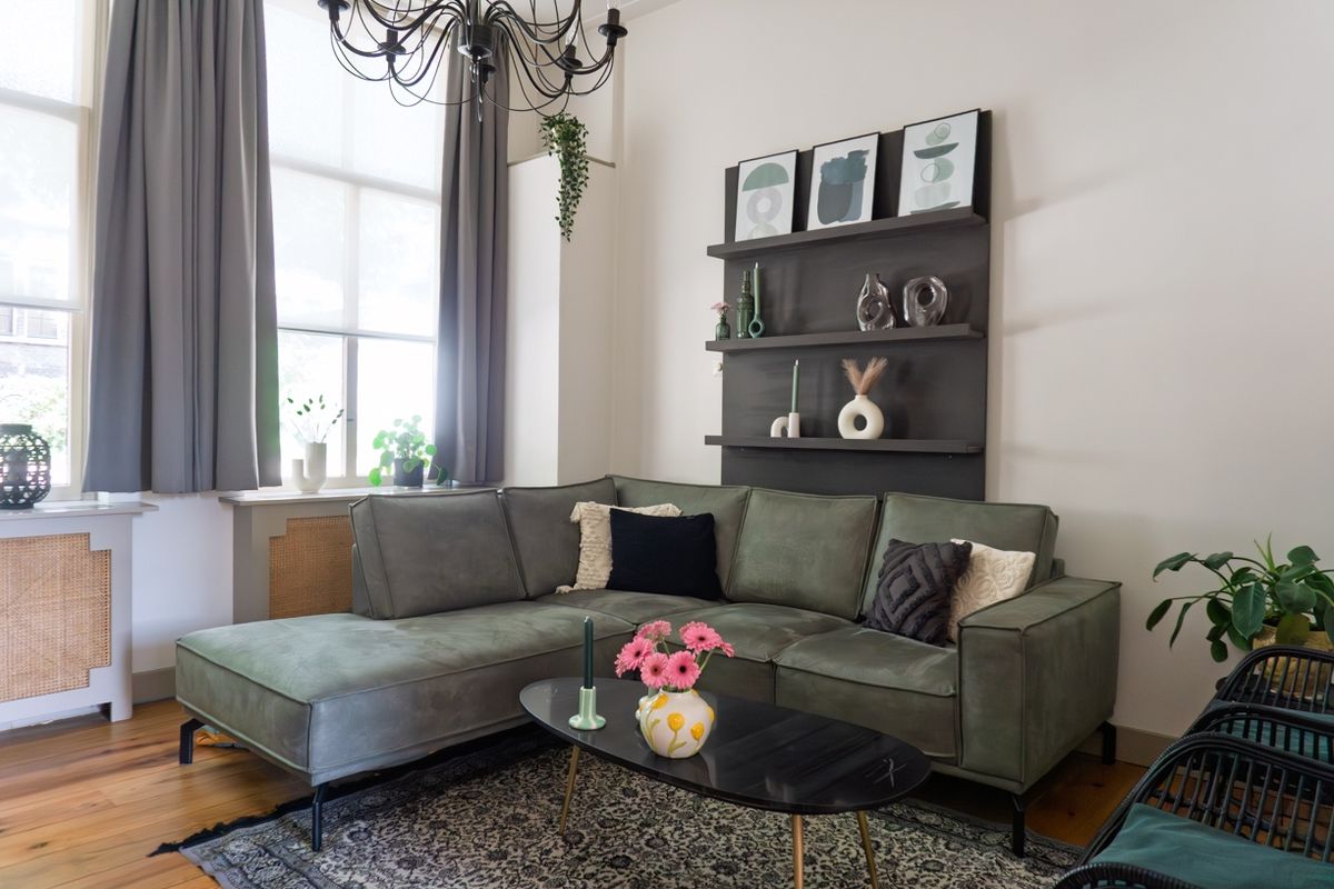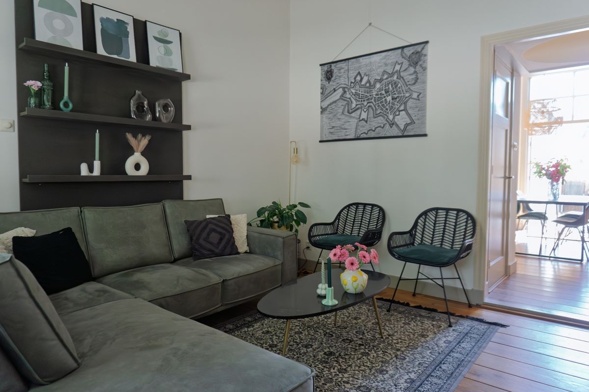 De woonkamer is verdeeld in een voorkamer en een achterkamer. Je komt de woonkamer binnen in de achterkamer. Hier bevinden zich tuindeuren die de verbinding maken met de typische stadstuin. In de overgang naar de voorkamer is in het plafond een, creatief bedachte, opening aanwezig waarin verlichting is aangebracht. Ook bevindt zich in de overgang een grote bergkast welke onder de trap doorloopt. De voorkamer is een gezellige ruimte waar een met marmer omklede schouw staat. De verwarming is netjes weggewerkt achter een koof. De woonkamer is afgewerkt met een houten vloer, en gestucte wanden en plafond.