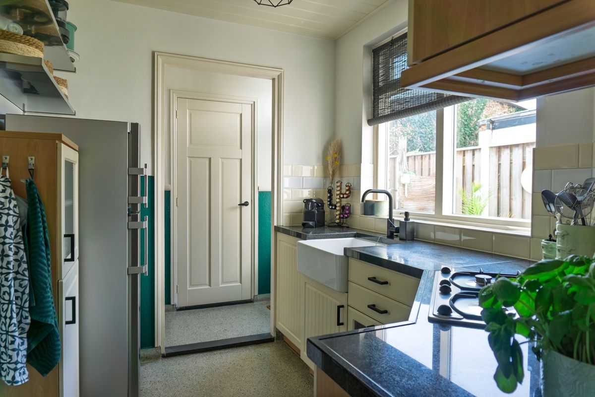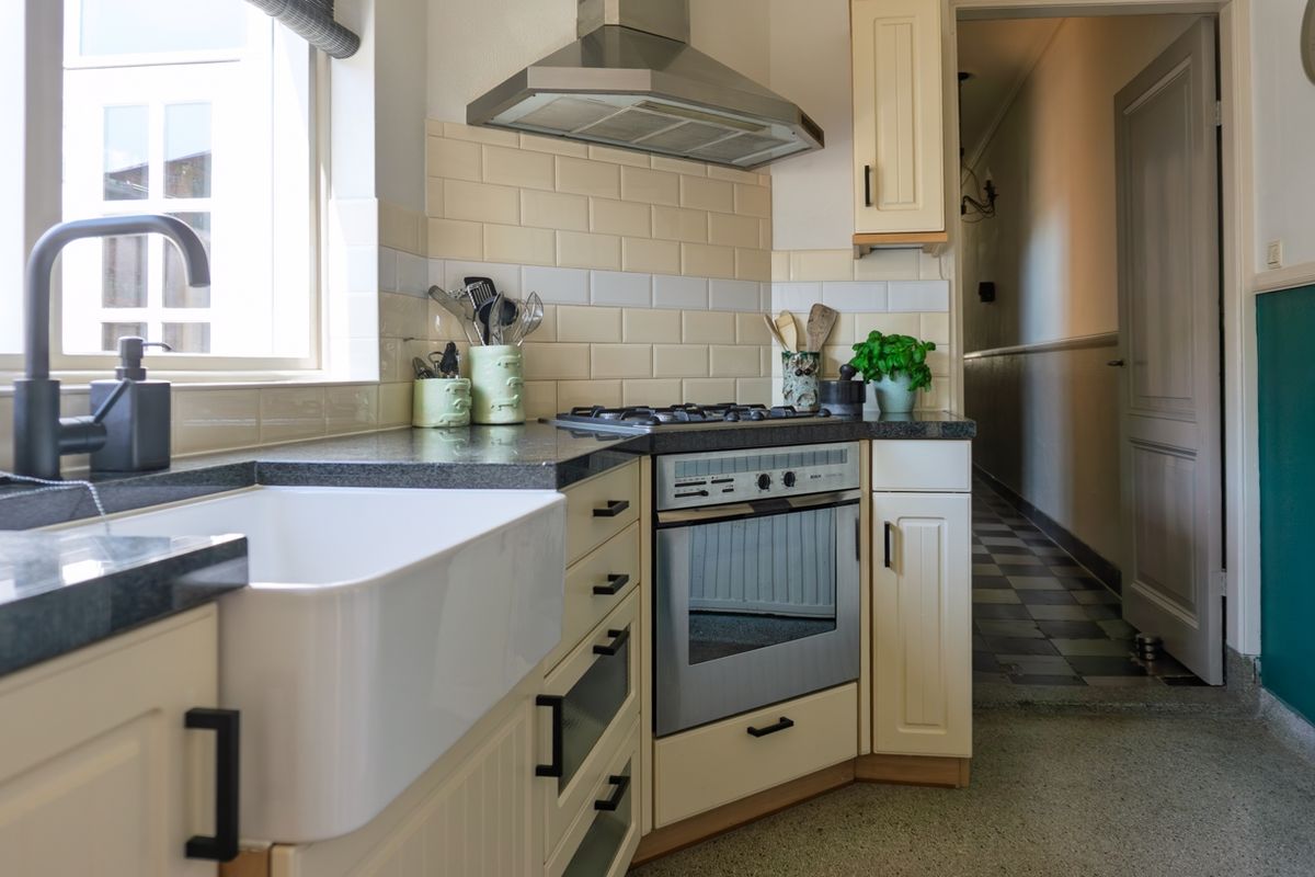 De keuken ligt aan het einde van de hal in de uitbouw van de woning. De keuken geeft toegang tot het achter de keuken gelegen portaal wat toegang geeft tot de achtertuin en een toilet en de bijkeuken. De keuken beschikt over een L-vormige keukenopstelling. Het werkblad is van natuurstenen en heeft een keramische spoelbak. Ingebouwd zijn een 4-pits gaskookplaat met hierboven de afzuigkap. Verder is ingebouwd een oven/grill waarvan de grillfunctie niet meer functioneert. De keuken is afgewerkt met deels betegelde wanden met hierboven stucwerk, een granito vloer en schroten aan het plafond.