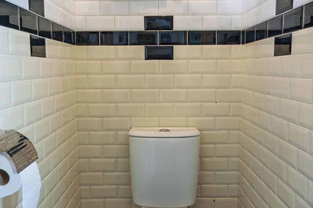 Naast de bijkeuken ligt het toilet. Het betreft een duoblok toilet. De afwerking bestaat uit betegelde wanden, een granitovloer en gipskartonplaat aan het plafond.