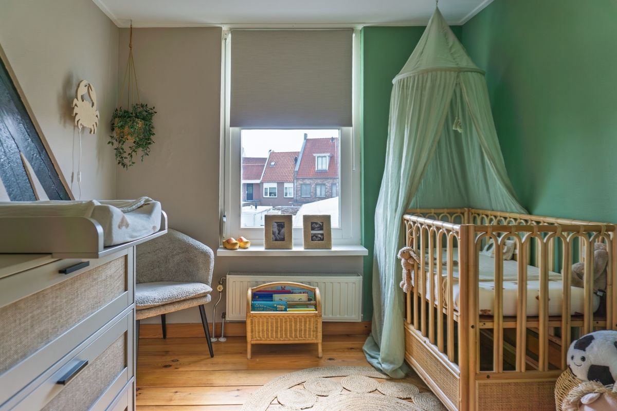 Deze slaapkamer ligt aan de achterzijde van de woning. De slaapkamer is nu in gebruik als gezellige babykamer. De afwerking van de slaapkamer is gelijk aan die van slaapkamer 1.
