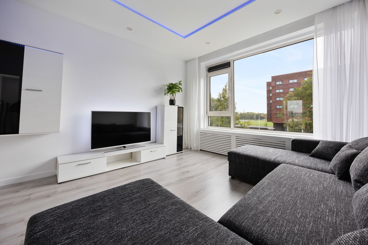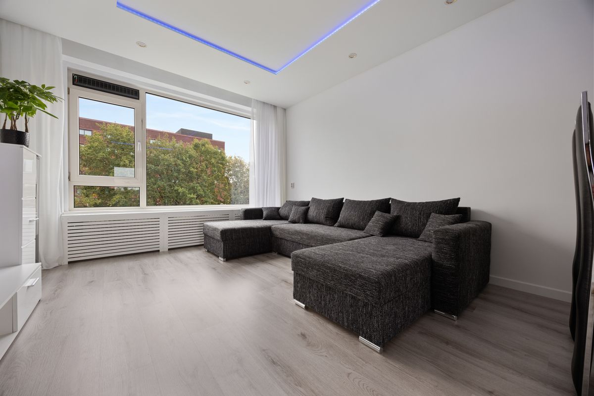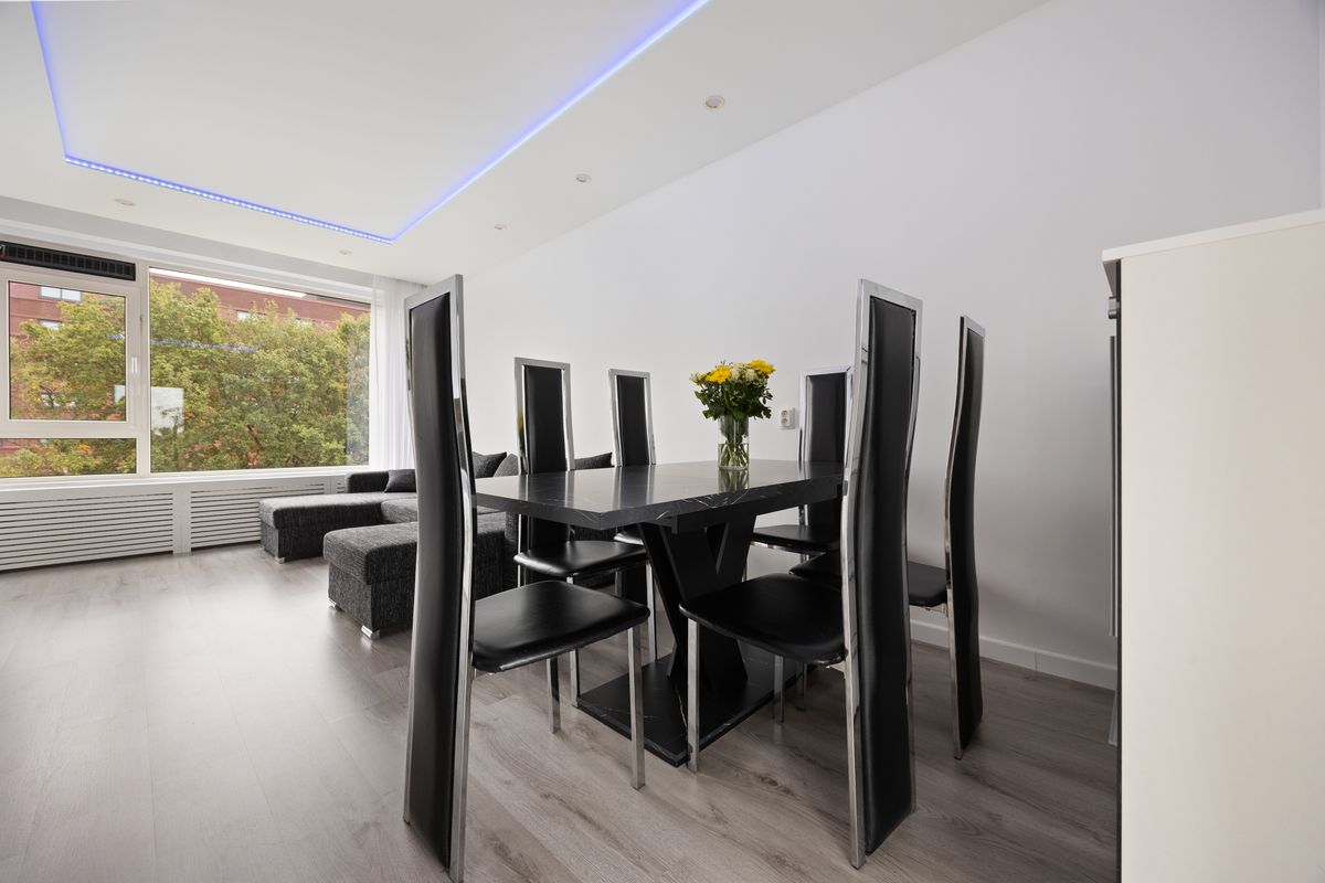 De woonkamer is licht en ruim opgezet met strak gestucte wanden en een verlaagd plafond met inbouwspots, wat een moderne, rustige sfeer geeft. Door de grote raampartijen komt er veel daglicht binnen. Er is ruimte voor een royale zithoek en een tv opstelling. Daarnaast is er voldoende ruimte voor een rechthoekige eettafel waar je met vier of zes personen kunt zitten.