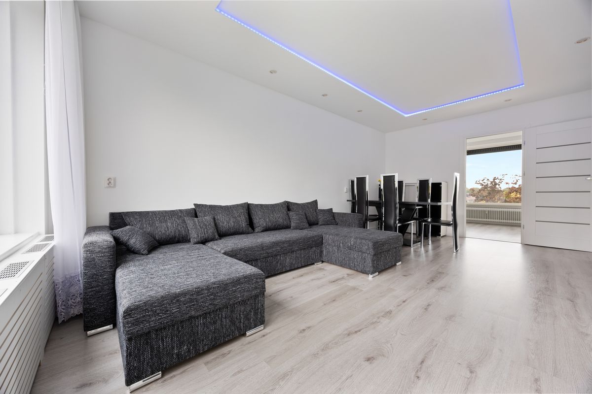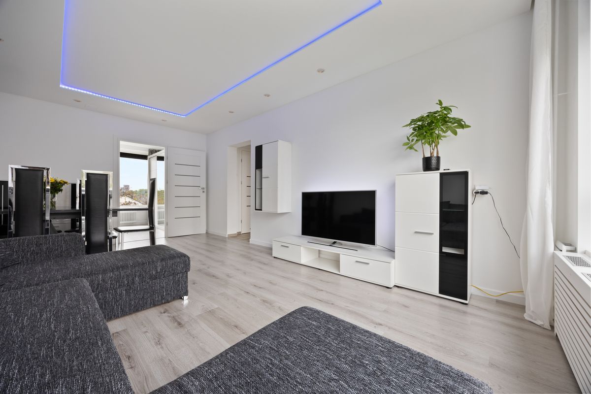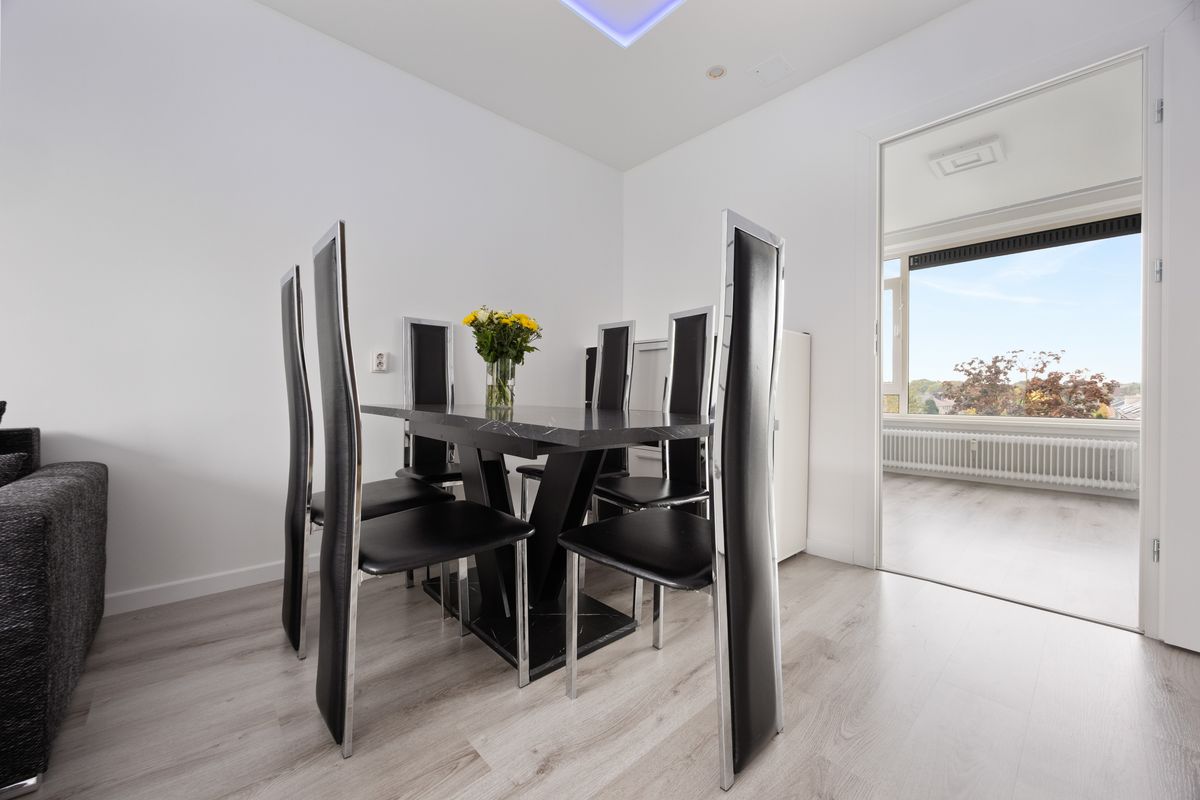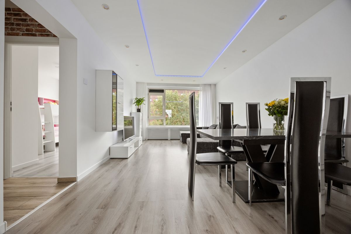 De woonkamer is licht en ruim opgezet met strak gestucte wanden en een verlaagd plafond met inbouwspots, wat een moderne, rustige sfeer geeft. Door de grote raampartijen komt er veel daglicht binnen. Er is ruimte voor een royale zithoek en een tv opstelling. Daarnaast is er voldoende ruimte voor een rechthoekige eettafel waar je met vier of zes personen kunt zitten.