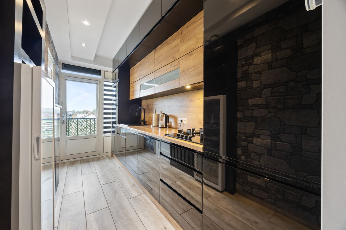 Vanuit de entree heb je direct toegang tot de keuken. De keuken is vier jaar geleden geplaatst, strak afgewerkt met een houten werkblad en ruim opgezet waardoor er veel opbergruimte is gerealiseerd. De keuken is uitgerust met een koelkast, aparte vriezer, ruimte voor een extra losse koelkast of vriezer, vierpits gasfornuis, vaatwasser, oven en magnetron. Vanuit de keuken geeft directe toegang tot het balkon. Het balkon heeft een praktisch formaat en biedt voldoende ruimte voor een zitje en wat potten met groen. Vanuit het balkon heb je toegang tot de ruimte waar je de Cv-installatie vindt. Vanuit het balkon heb je een vrij uitzicht over de Aubadestraat en omdat het gelegen is op het zuidwesten kun je hier vanaf 11:00 heerlijk genieten van de zon, ideaal om de dag te starten met een kop koffie of de middag af te sluiten met een glas wijn!