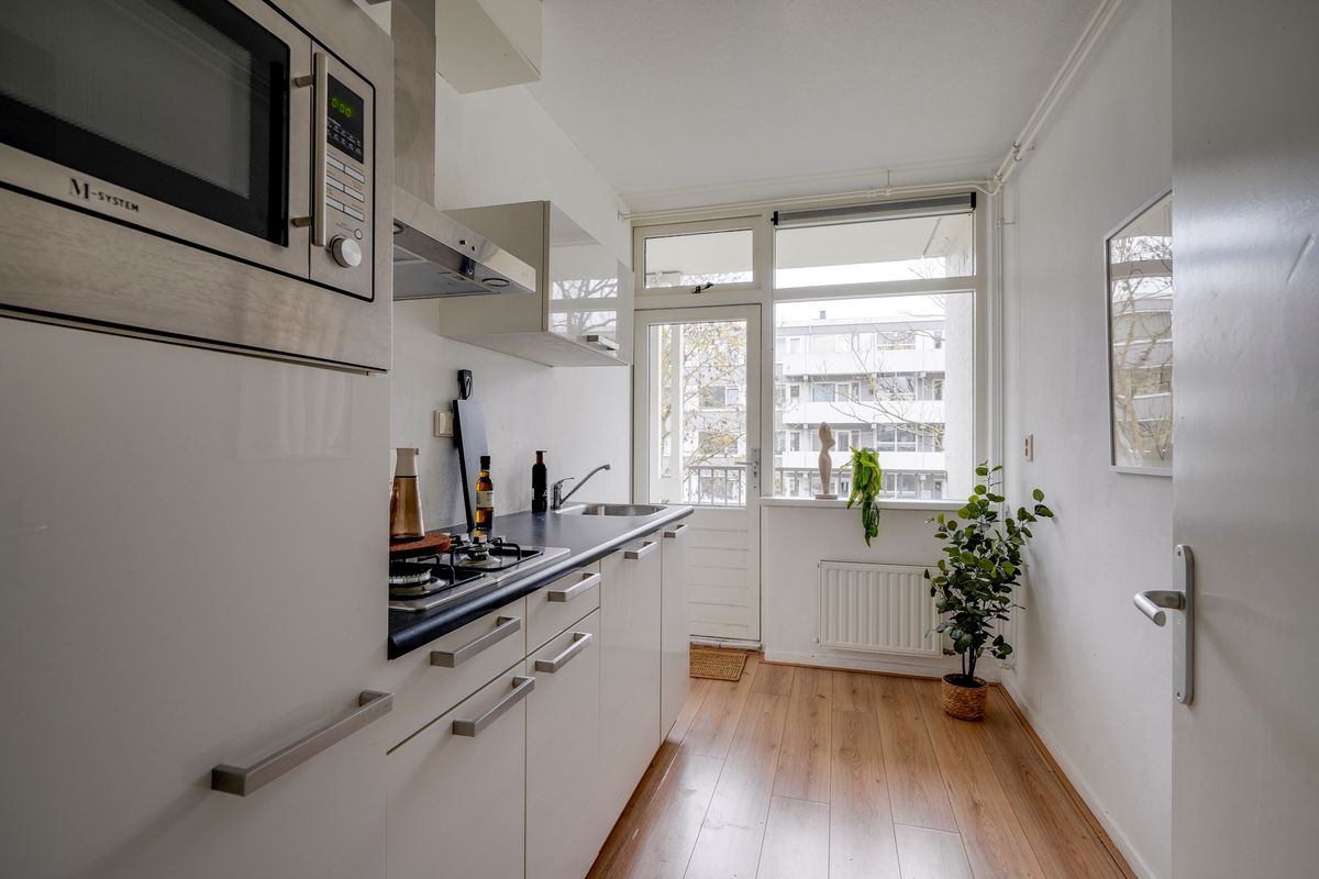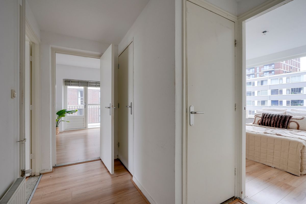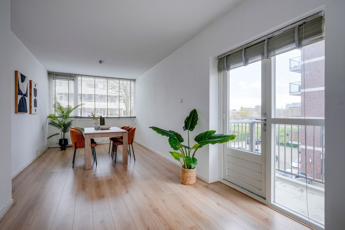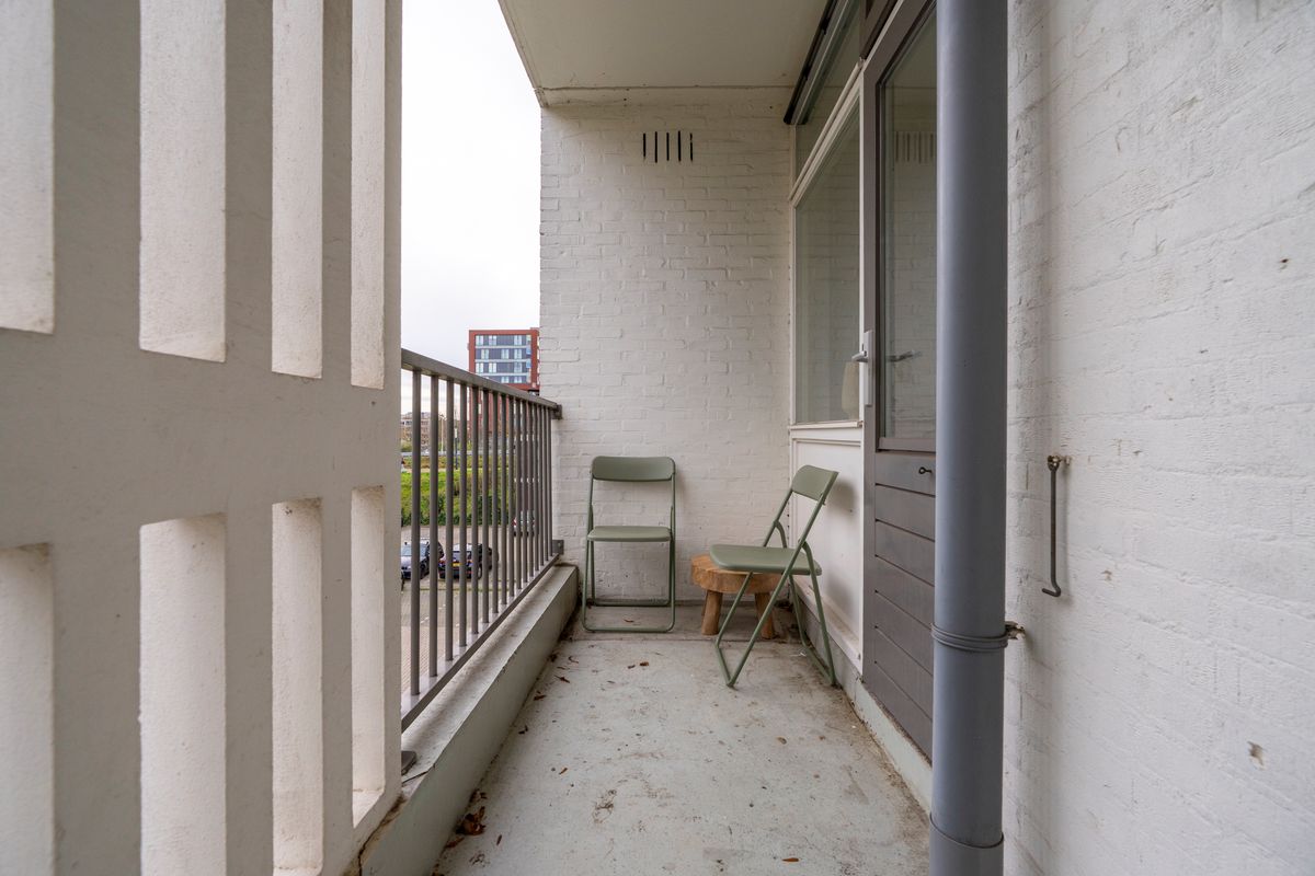 De hal geeft toegang tot alle vertrekken, waardoor de indeling overzichtelijk en efficiënt is. De doorzonwoonkamer zorgt voor een fijne hoeveelheid daglicht en biedt volop ruimte om naar eigen smaak in te inrichten. Het appartement is gelegen op de hoek, waardoor het meer daglicht heeft en een balkon aan de zijkant van de woning. De aparte keuken is uitgerust met diverse inbouwapparatuur en geeft toegang tot het balkon aan de achterzijde. Er zijn twee slaapkamers. De badkamer is netjes afgewerkt en voorzien van een inloopdouche, wastafel en toilet, met een raam voor natuurlijke ventilatie. Dit appartement heeft zonnepanelen op het dak.