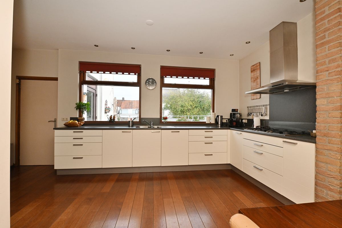 De keuken is in hoekopstelling geplaatst en voorzien van een 5-pits gasfornuis, afzuigkap in schouwmodel, oven, koelkast, vriezer en vaatwasser. Vanuit de keuken kijkt u uit over het dakterras.