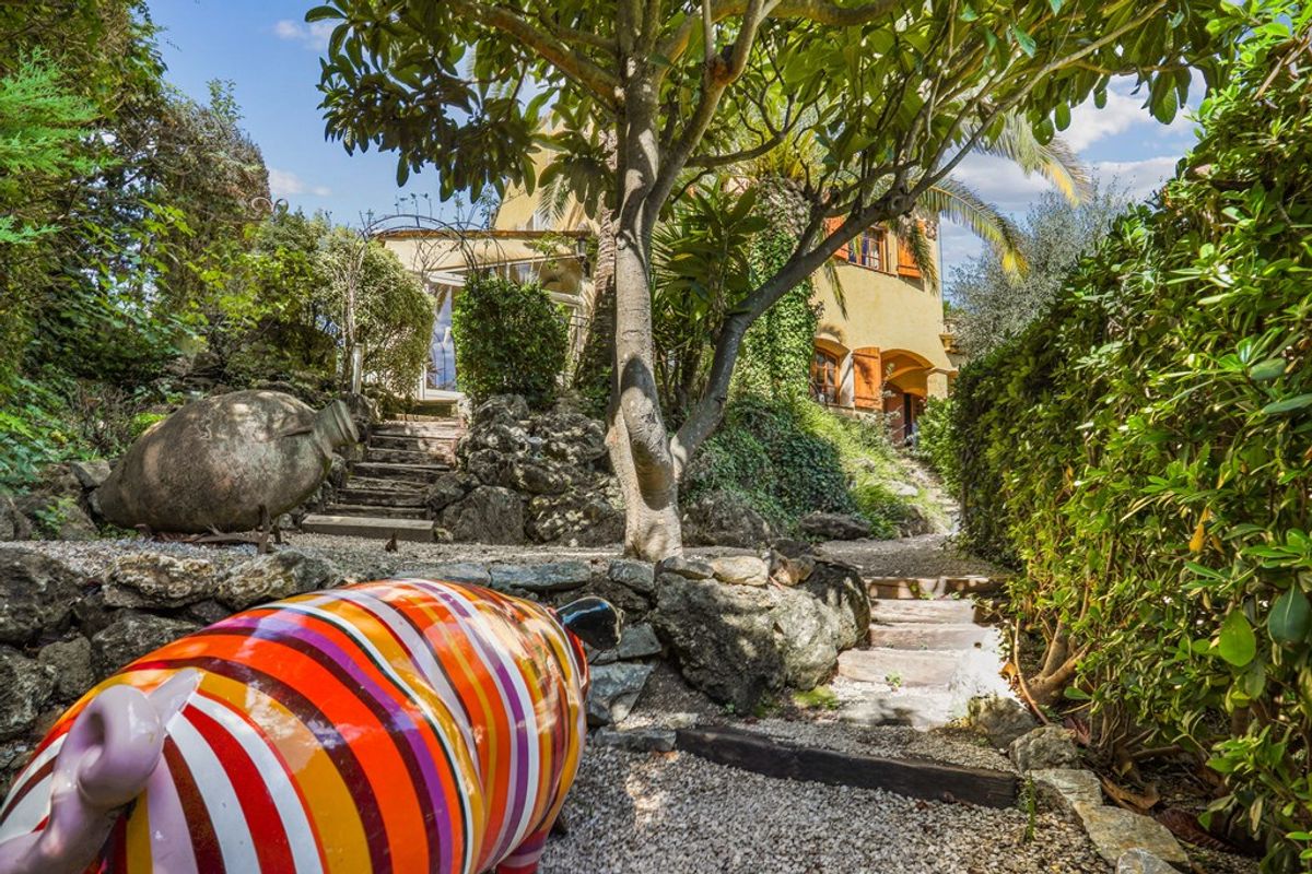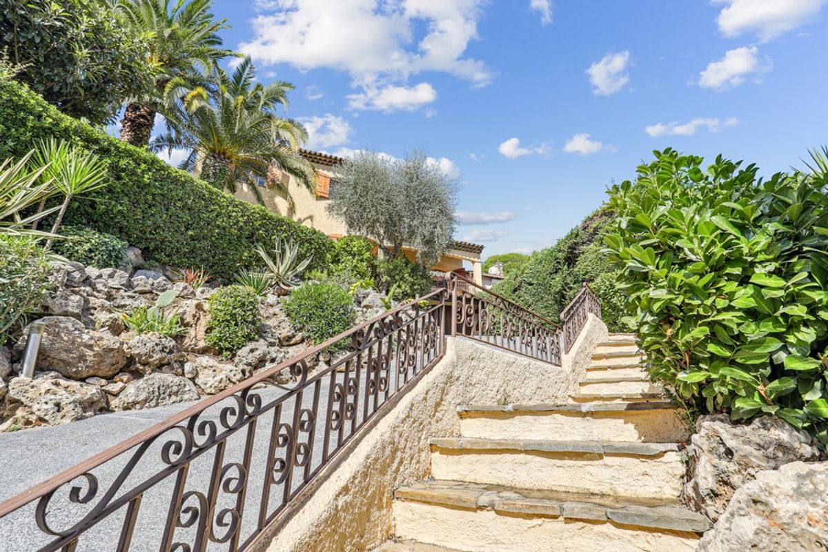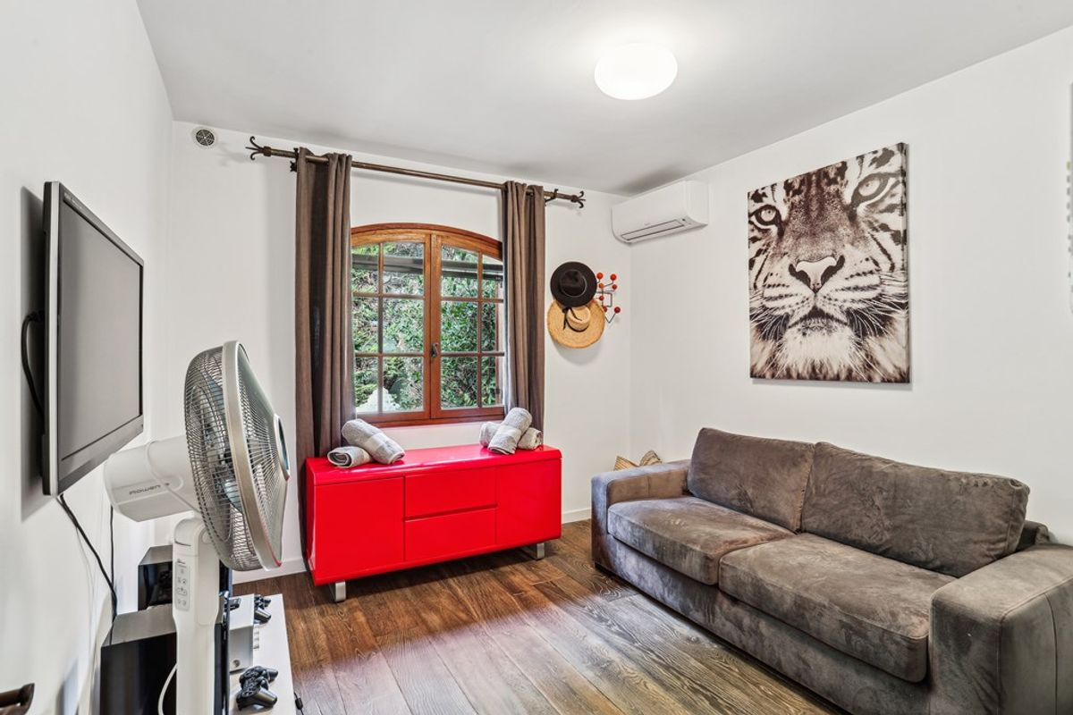 Op dezelfde verdieping bevinden zich twee tweepersoonsslaapkamers met een gedeelde doucheruimte, evenals een berging. De lichte en uitnodigende woonkamer grenst aan een extra eethoek. Achter het huis bevindt zich nog meer buitenruimte en een trap naar het zwembad, met een terras en een jeu de boulesbaan. De tuin is voorzien van een automatisch sproeisysteem en sfeervolle verlichting voor de avonden aan de Côte d'Azur.