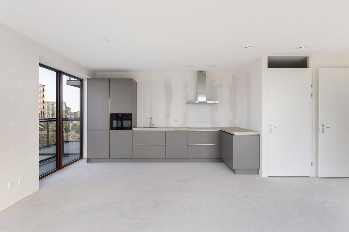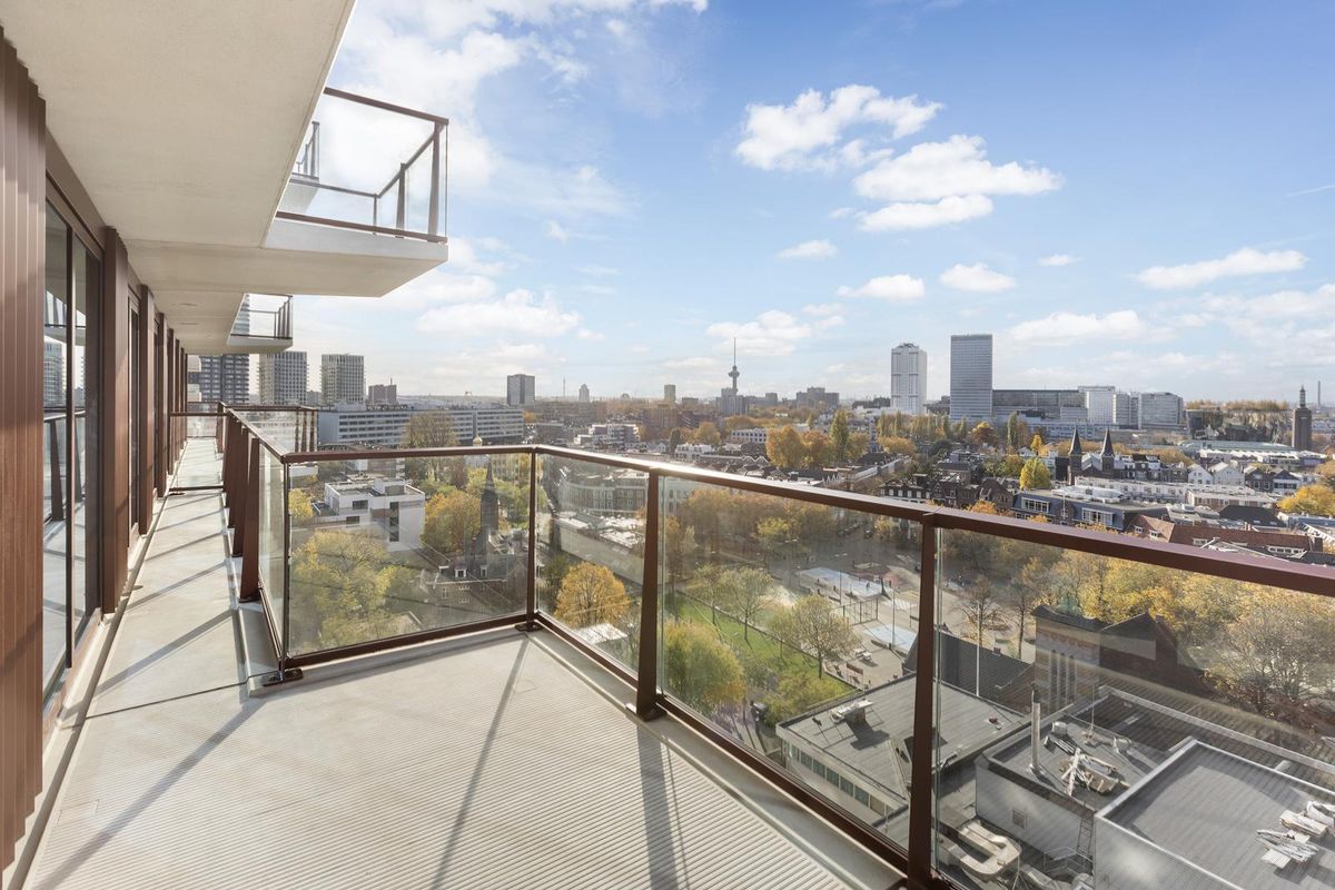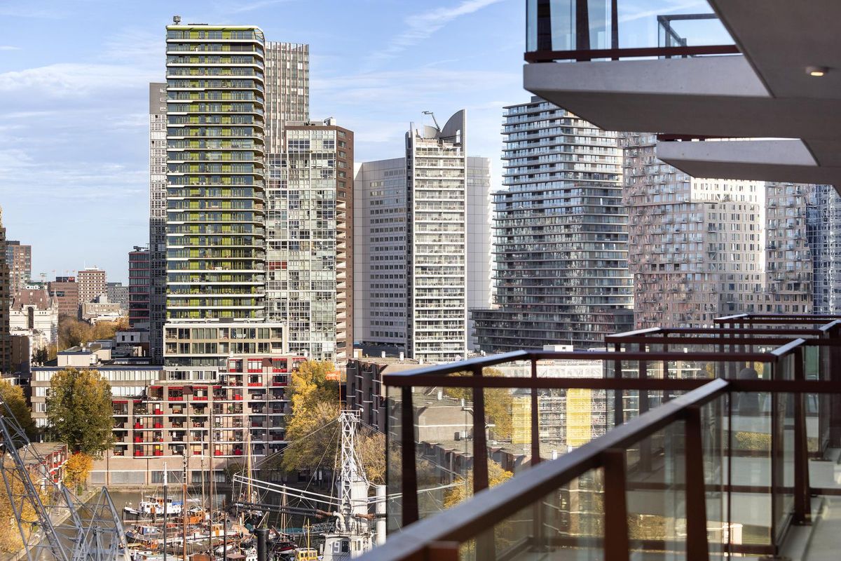 DRVM presenteert: een hoekappartement hoog boven de stad, licht van zonsopkomst tot skyline-nacht, met een balkon dat Rotterdam in elke richting omarmt.