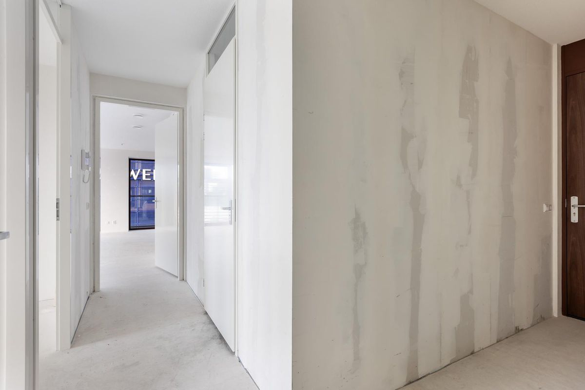 Met de lift zoef je naar de 13e verdieping, waar je via de galerij bij de entree van het appartement komt. Binnen stap je de gang in: een rustige, verzorgde ruimte die direct overzicht geeft.