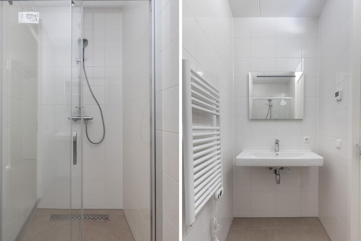 Tegenover de tweede slaapkamer ligt de badkamer. Deze is netjes en functioneel ingericht, met een douche met schuifdeur en een wastafelmeubel. Een praktische, frisse ruimte, passend bij het moderne karakter van het complex.
