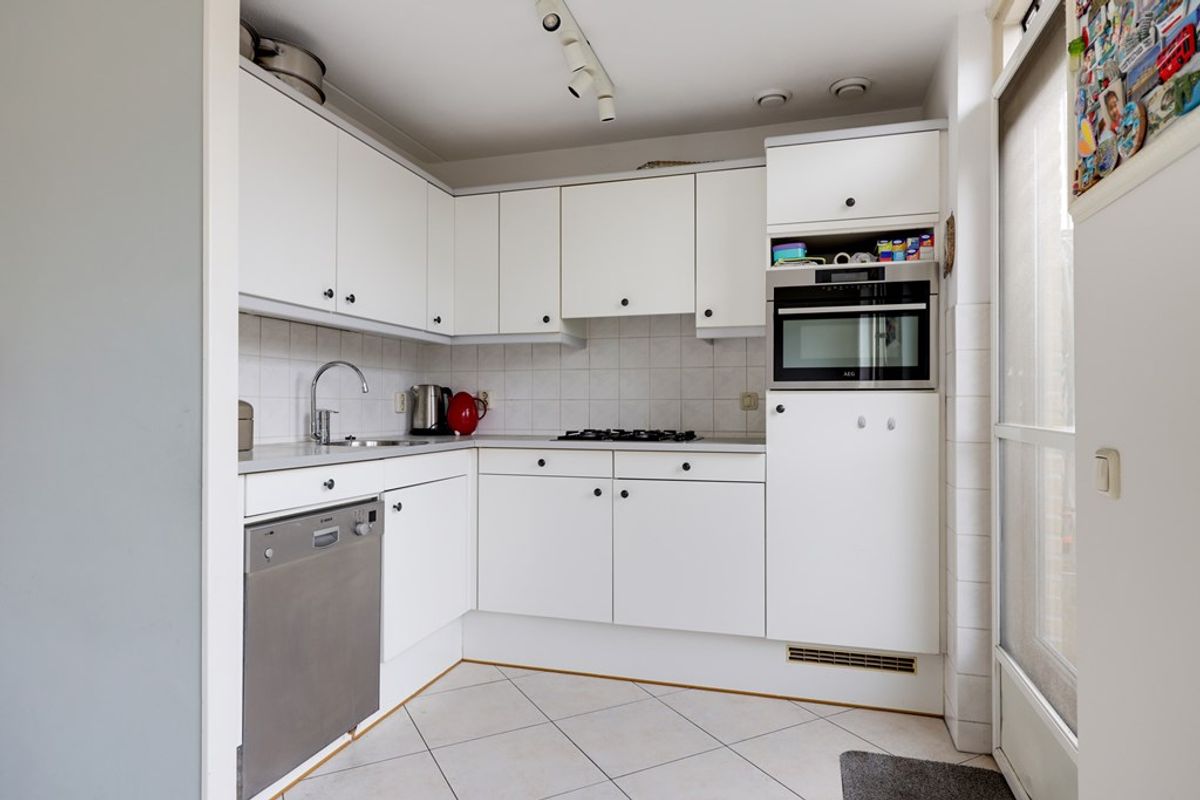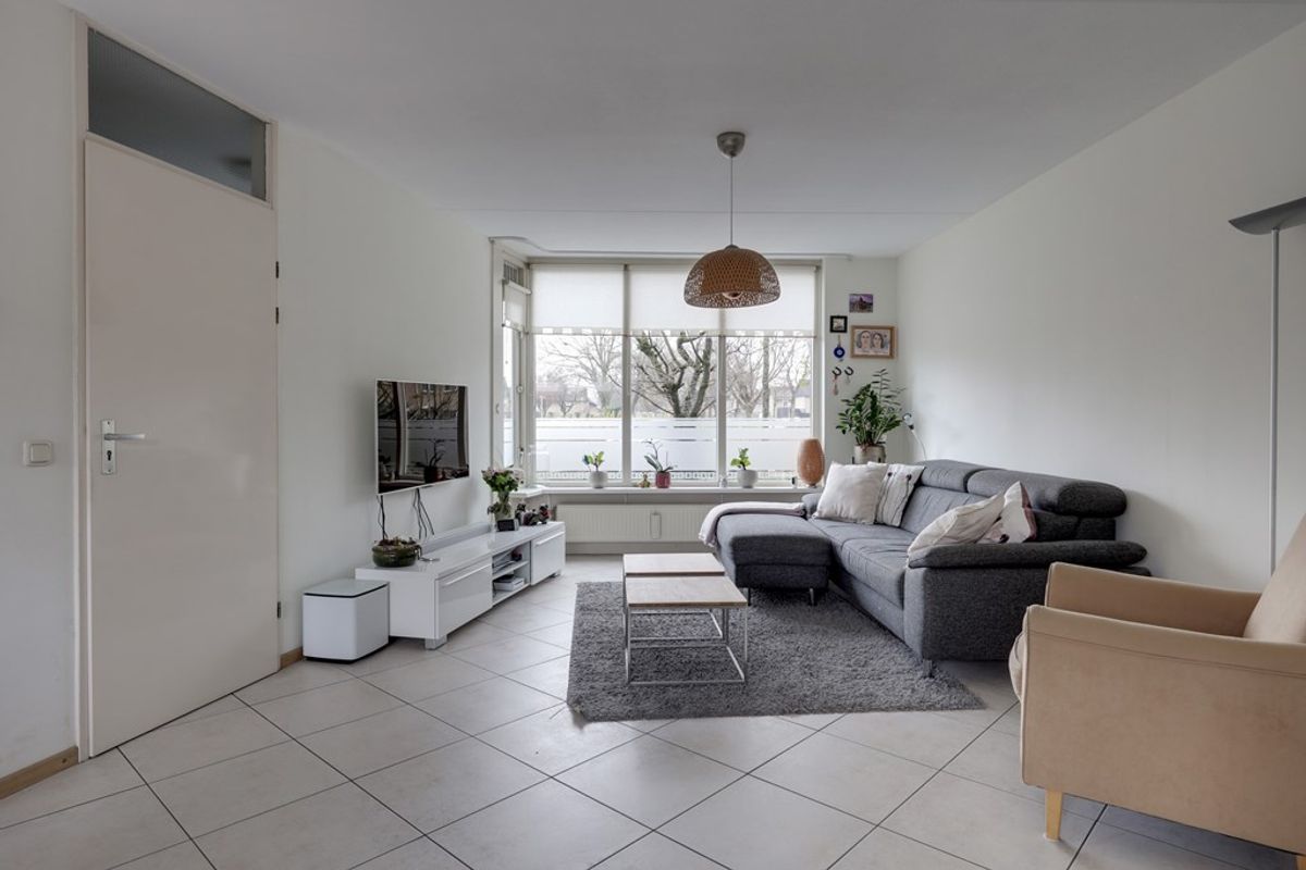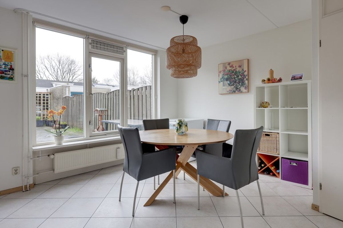 De woonkamer is voorzien van een mooie tegelvloer, wat niet alleen stijlvol is, maar ook praktisch in het onderhoud. Dankzij de grote ramen komt er veel natuurlijk licht binnen en geniet u van een aangename sfeer en een vrij uitzicht. De woonkamer biedt tevens directe toegang tot de achtertuin, waar u heerlijk kunt ontspannen en genieten van privacy.