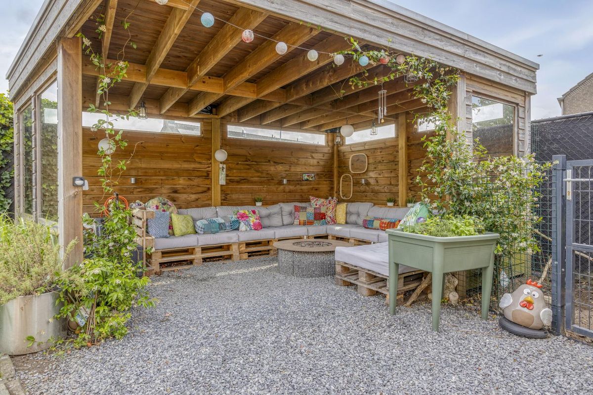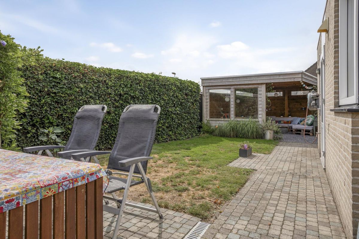 De achtertuin is verzorgd aangelegd en gelegen op het oosten. Hier vind je meerdere terrassen, een tuinhuis, een overkapping en een vrije achterom. Aan de voorzijde van de woning is er dankzij de ruime oprit voldoende parkeergelegenheid.