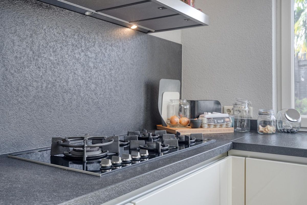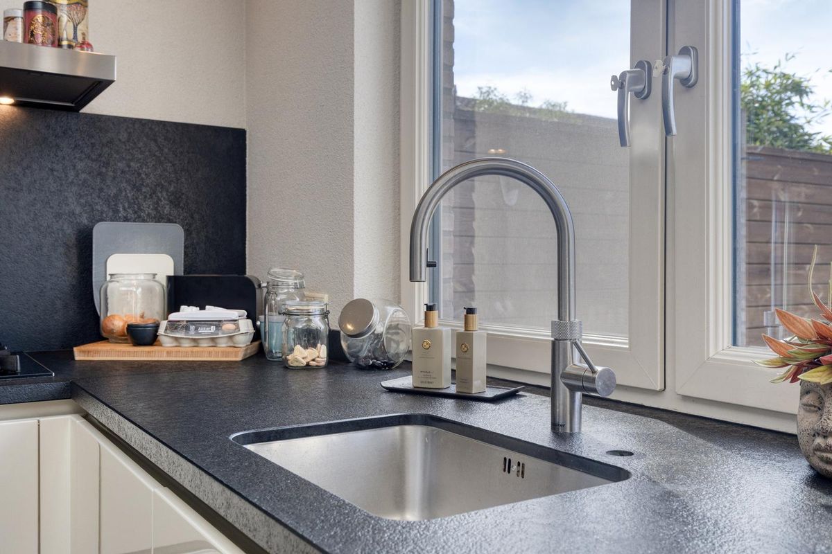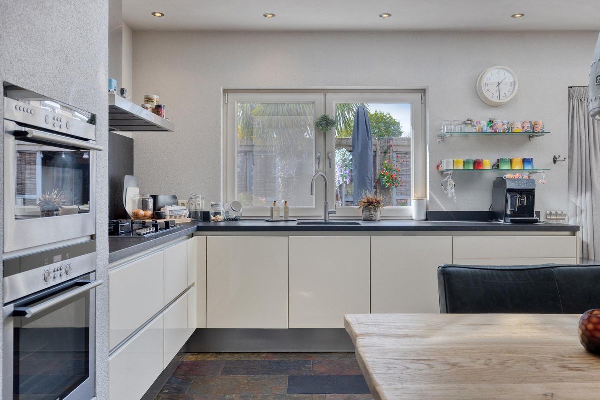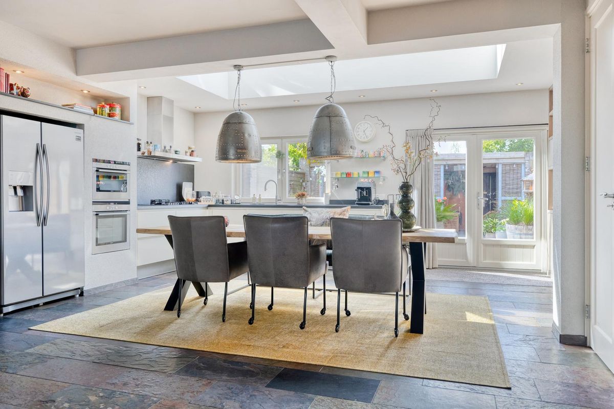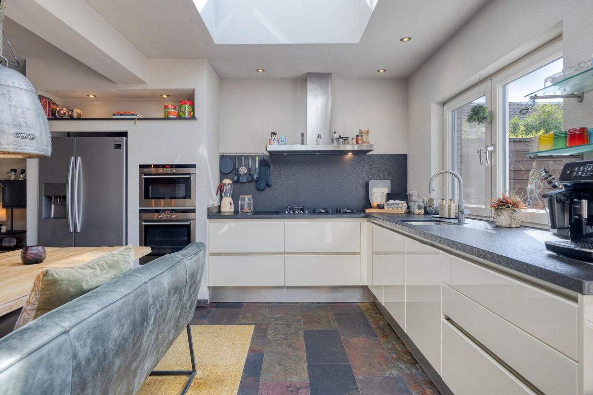 De royale woonkamer is een heerlijke leefruimte met veel lichtinval, openslaande tuindeuren naar het terras en een sfeervolle gashaard die het hart van het huis vormt. De open keuken is een echte eyecatcher: modern, strak en van alle denkbare luxe voorzien, waaronder een 5-pits gaskookplaat, Quooker, combi-oven, vaatwasser en een koel-/vriescombinatie.