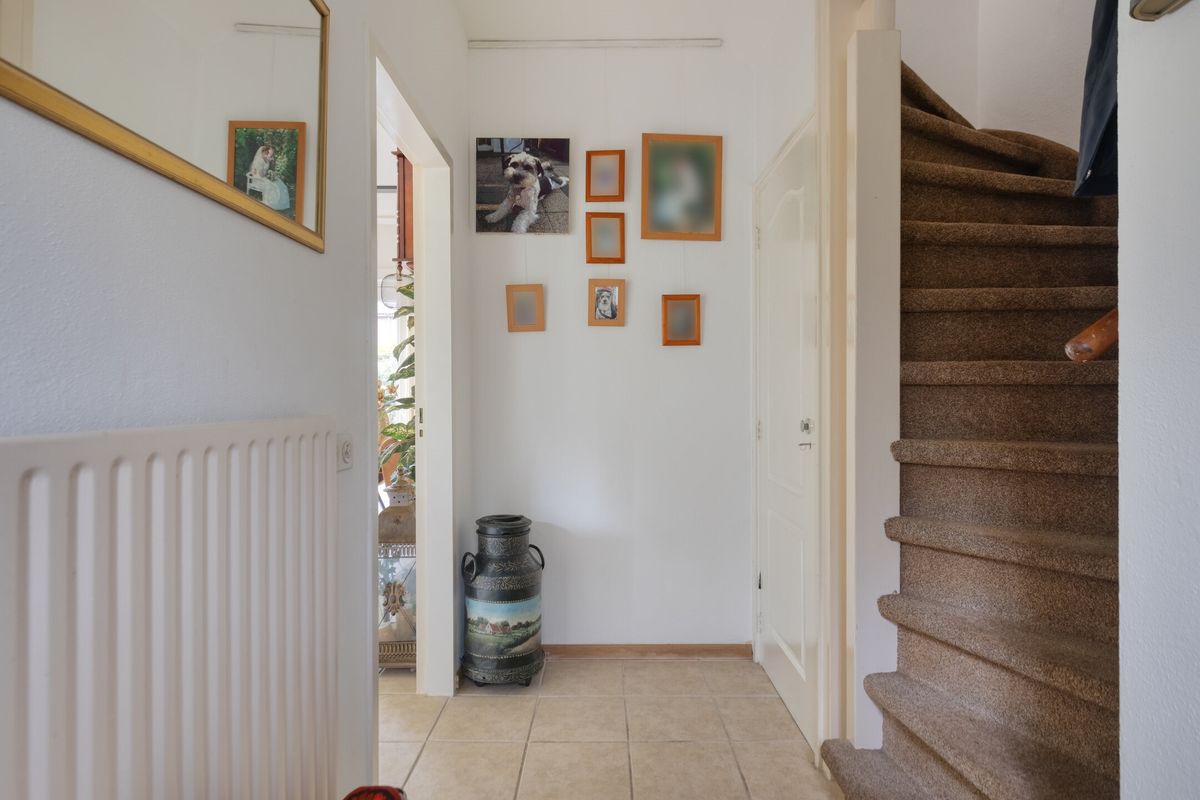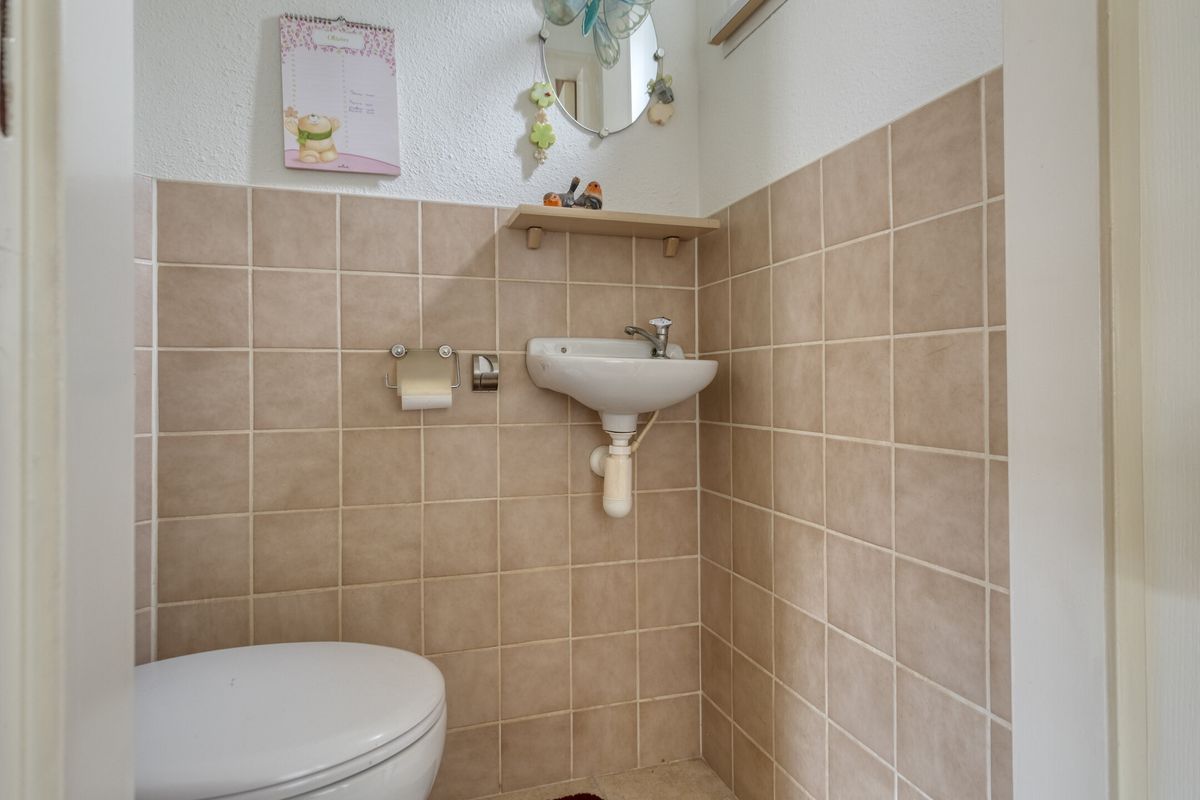 Op de eerste verdieping zijn drie slaapkamers, allemaal voorzien van rolluiken, en een praktische badkamer met douche en een wastafel met meubel. Via een vaste trap is de ruime bergzolder bereikbaar, die ideaal is als extra opbergruimte.