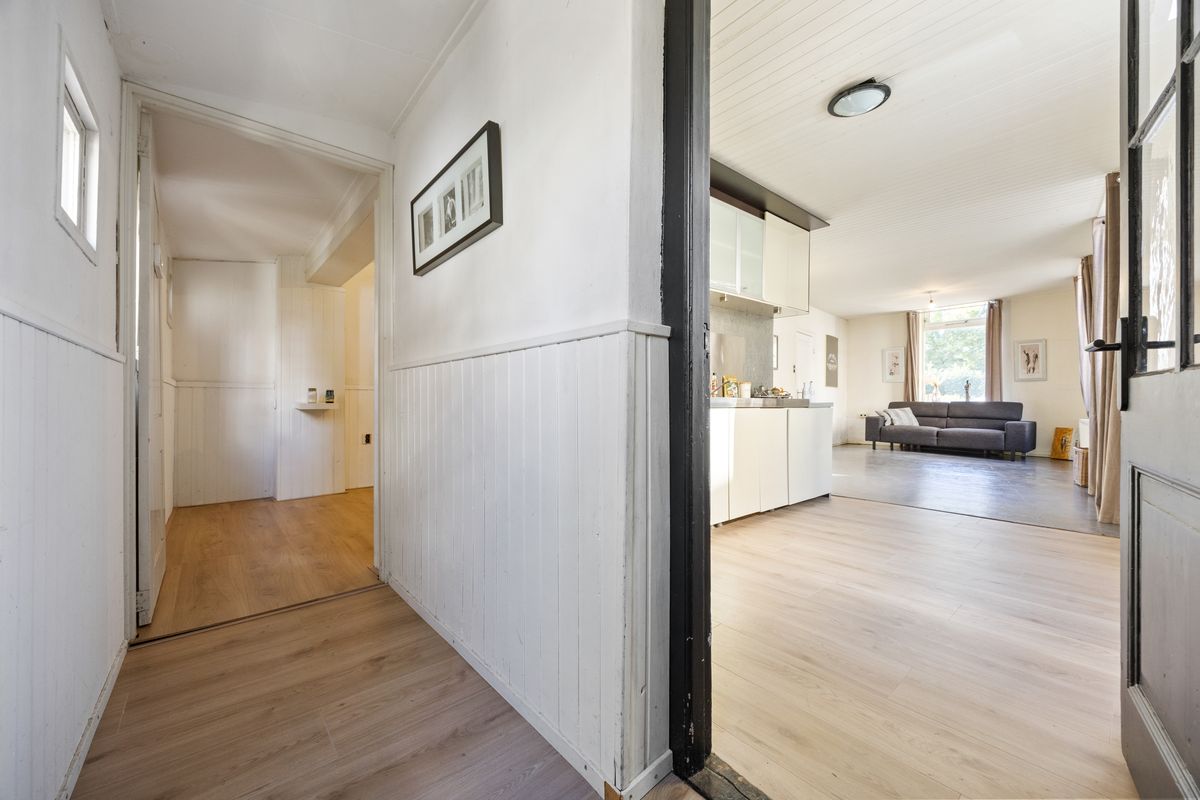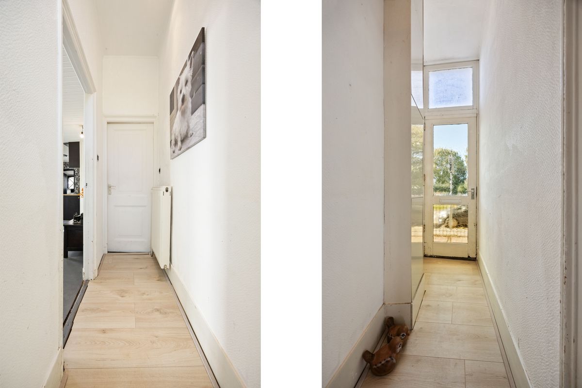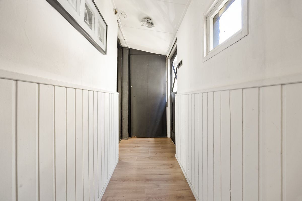 Tussen de keuken en de hal bevindt zich een hal en vanuit deze hal heb je toegang tot de slaapkamer. De slaapkamer ligt aan de stille achterzijde van de woning. Ruim genoeg voor een tweepersoonsbed en kast. Een fijne, rustige plek om je terug te trekken na een drukke dag.