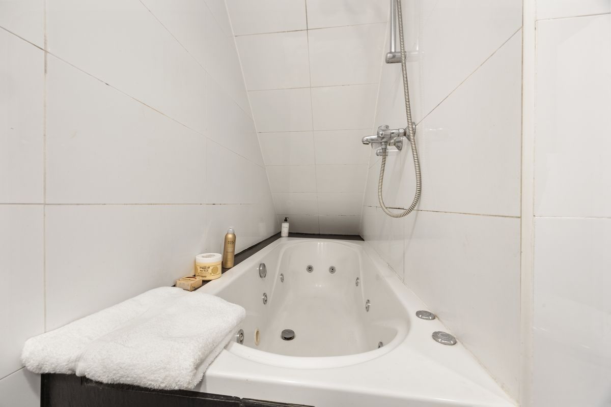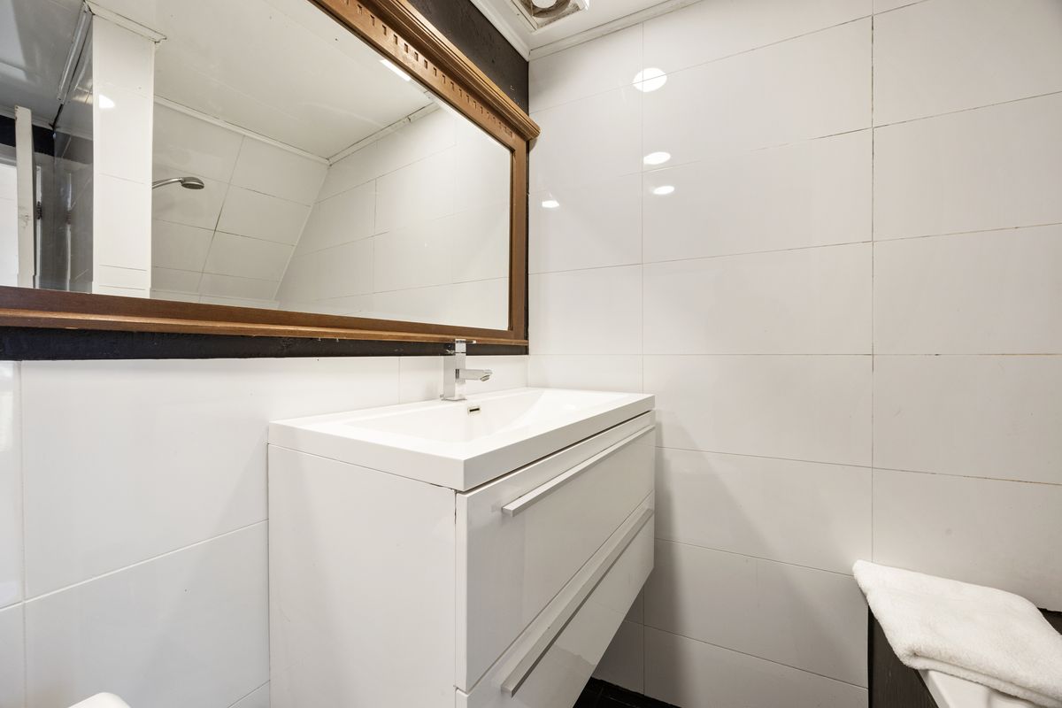Wanneer we teruglopen naar de entree, vinden we aan onze linkerhand de badkamer. De inpandige badkamer is praktisch ingedeeld met een ligbad met douche, toilet en wastafel met meubel. Onder de badkamer bevindt zich een kleine kelder met de cv-installatie, handig voor opslag of technische installaties.