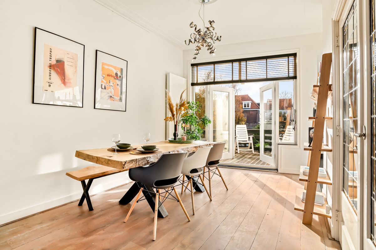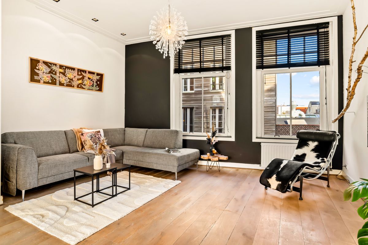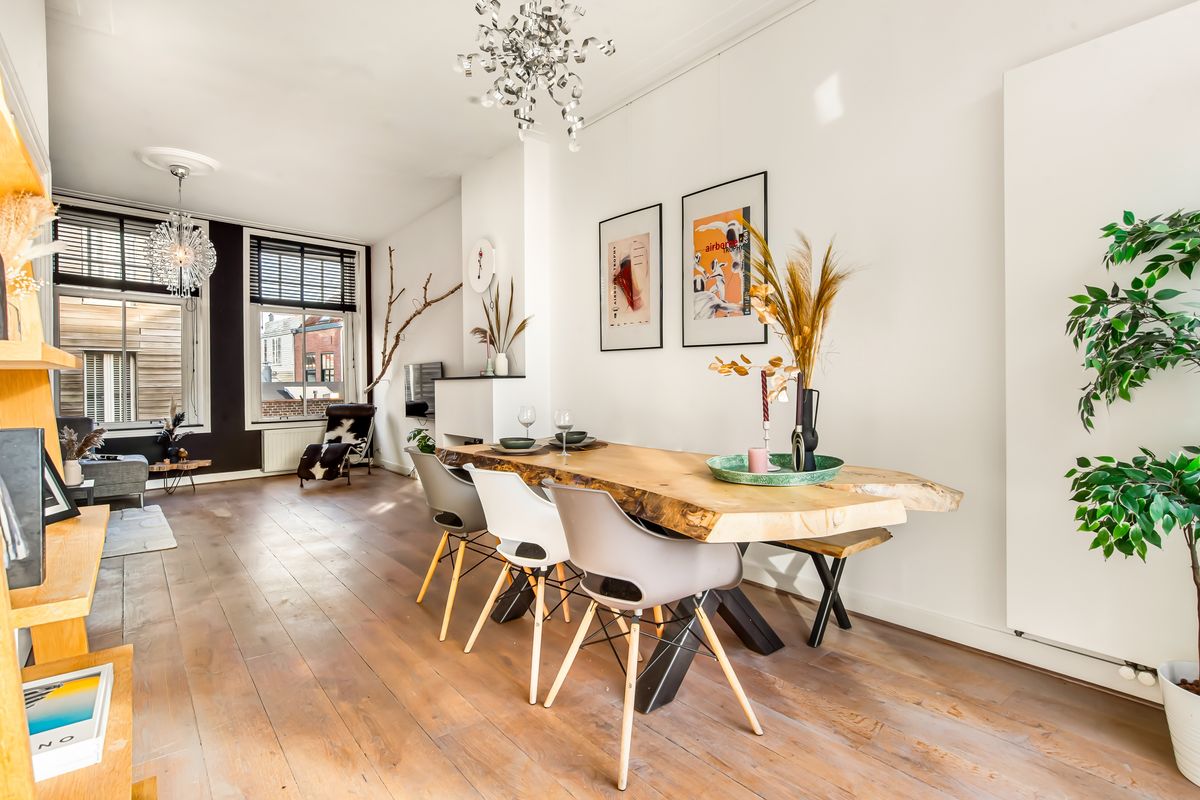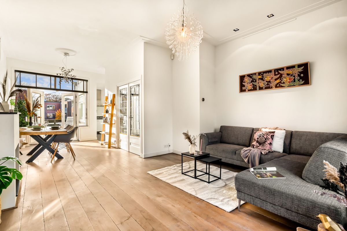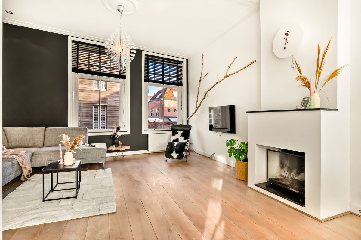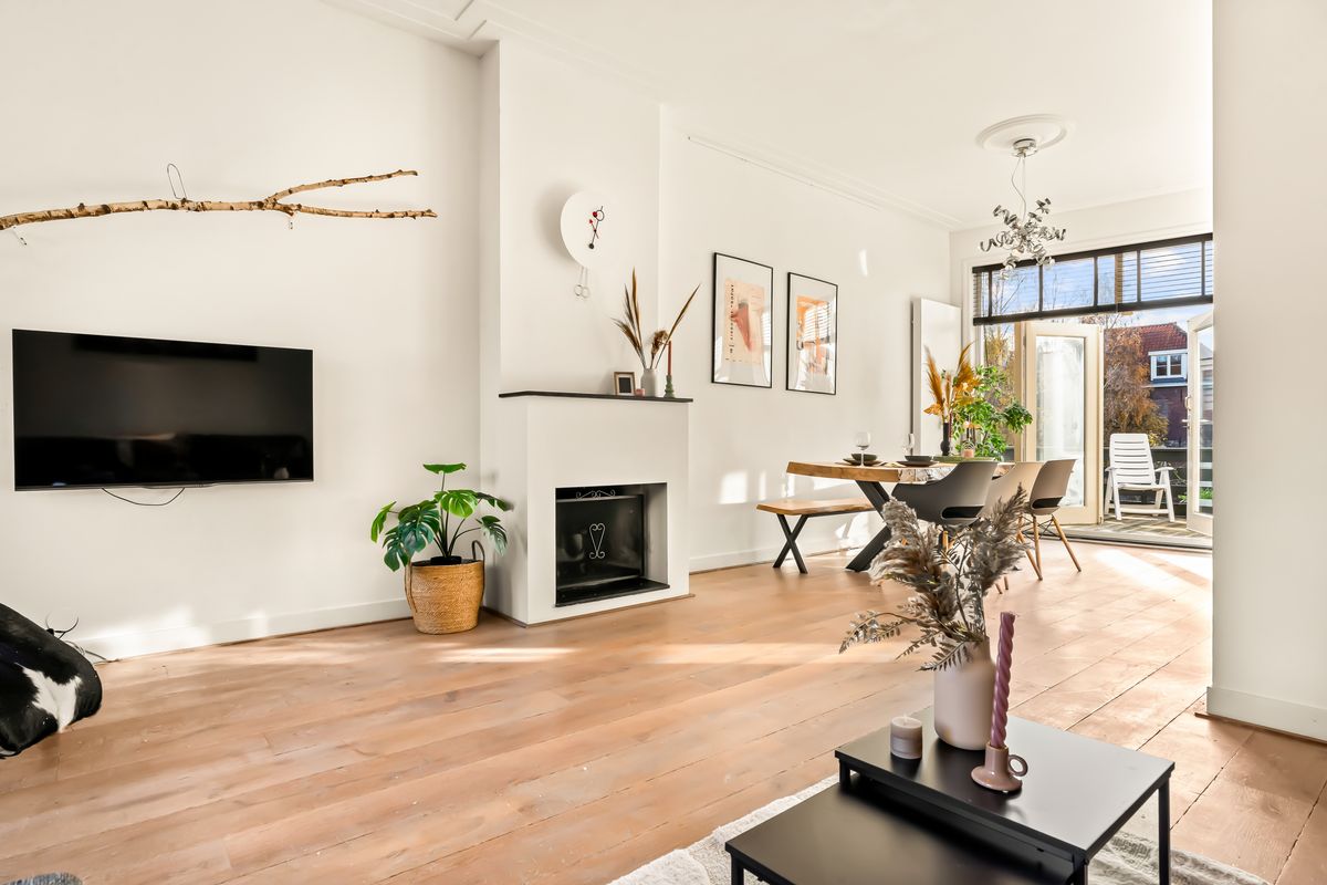 De woning combineert karakter en comfort: de lichte woonkamer heeft een mooie houten vloer, een hoog plafond en grote raampartijen aan de straatzijde, waardoor er de hele dag veel daglicht binnenvalt.