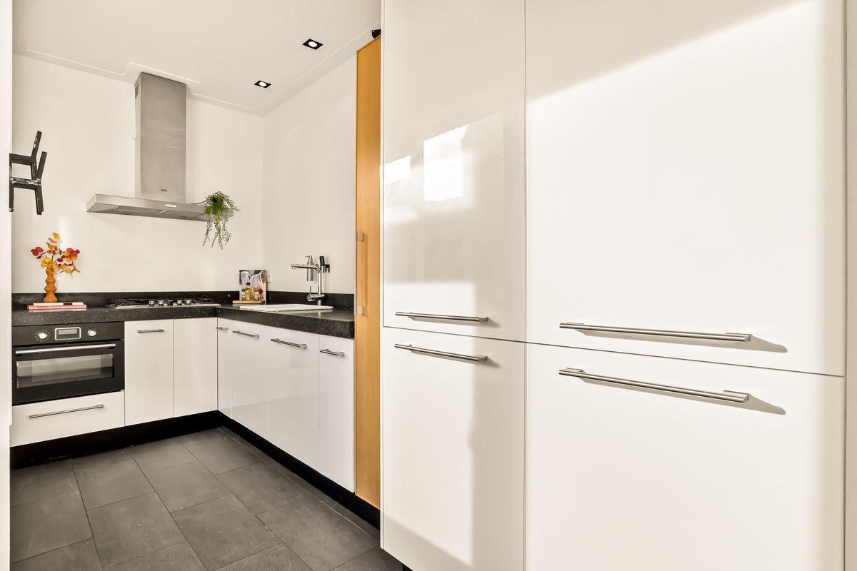 De moderne semi-open keuken sluit prettig aan op de woonkamer: tijdens het koken heb je gezellig contact met de mensen in de woonkamer, terwijl het toch een afzonderlijke ruimte blijft. De keuken is praktisch ingedeeld en voorzien van diverse inbouwapparaten.