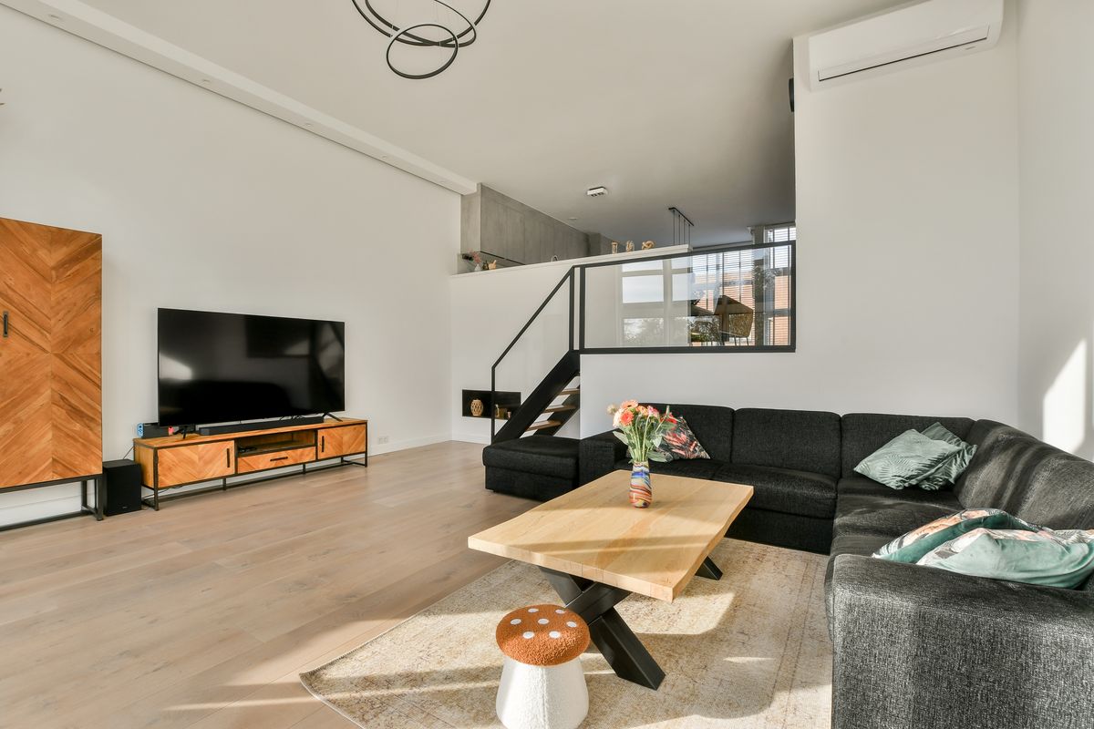 The kitchen and all sanitary facilities were fully renewed in 2021. The kitchen has a modern design and is fitted with high-quality built-in appliances, including a Quooker with a 7-litre boiler. The bathrooms, also installed in 2021, have a luxurious feel with beautiful materials and contemporary finishes. Both the living room and the kitchen feature a beautiful wooden floor. In the living room, steel railings and staircases create a stylish, industrial look, while the steel sliding doors between the kitchen and living area perfectly complement the home’s high-quality finish.