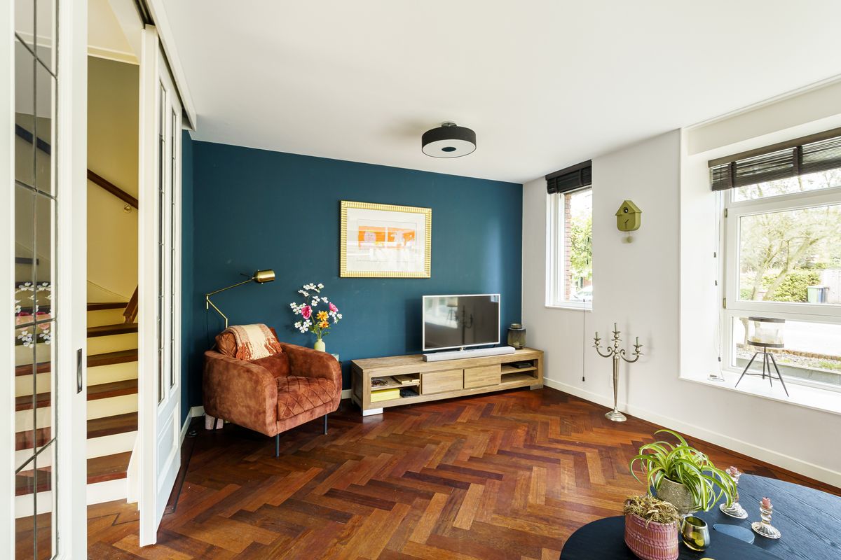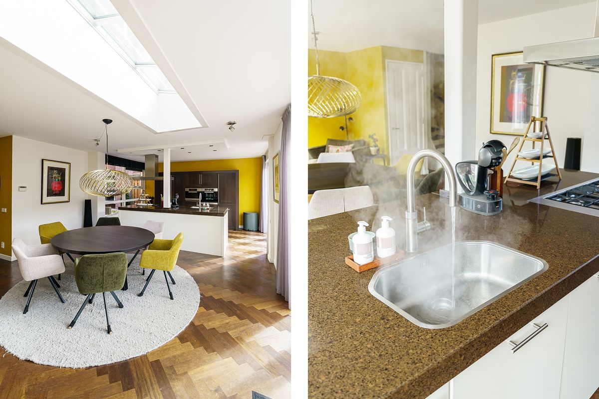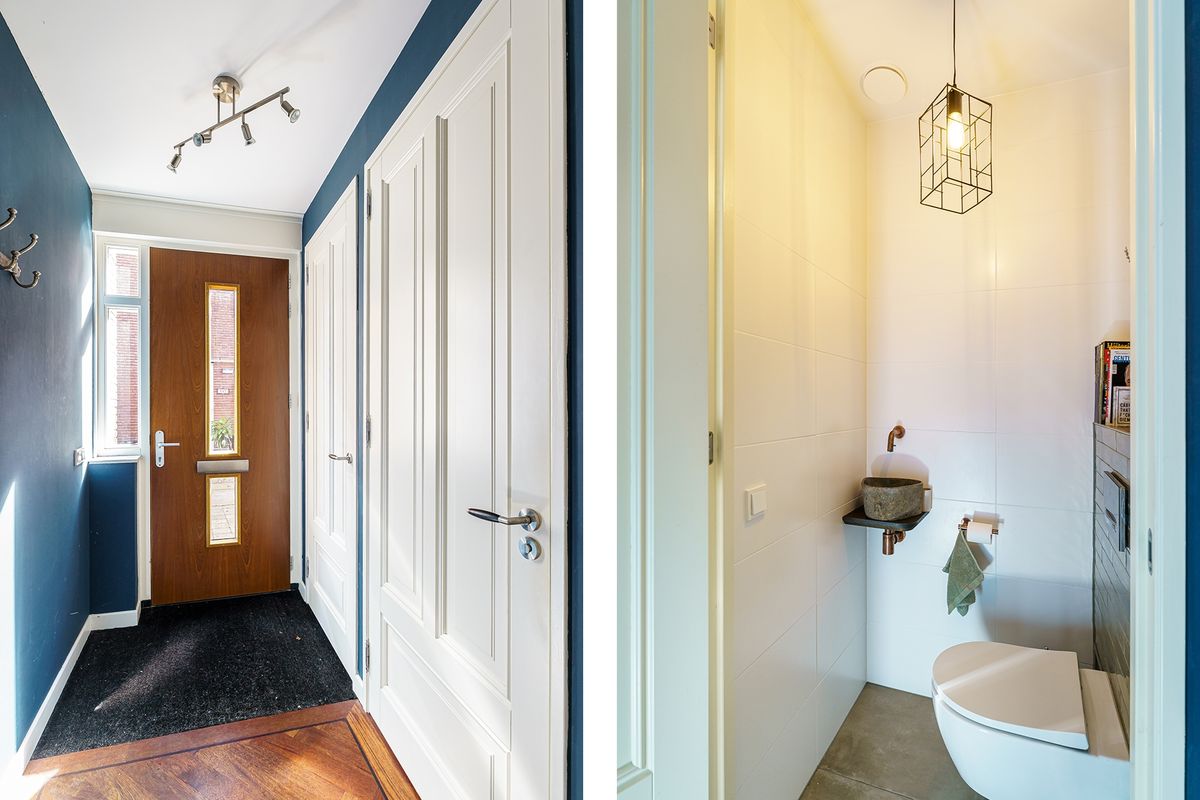 De entree bevindt zich aan de zijkant van het huis. Vanuit de hal met toilet kom je in de ruim opgezette leefruimte. De lichte woonkamer aan de voorzijde kan sfeervol worden afgesloten met fraaie schuifdeuren. Een verdiept raamkozijn rondom de hoek zorgt voor extra lichtinval en biedt een mooie plek voor je favoriete planten of accessoires.