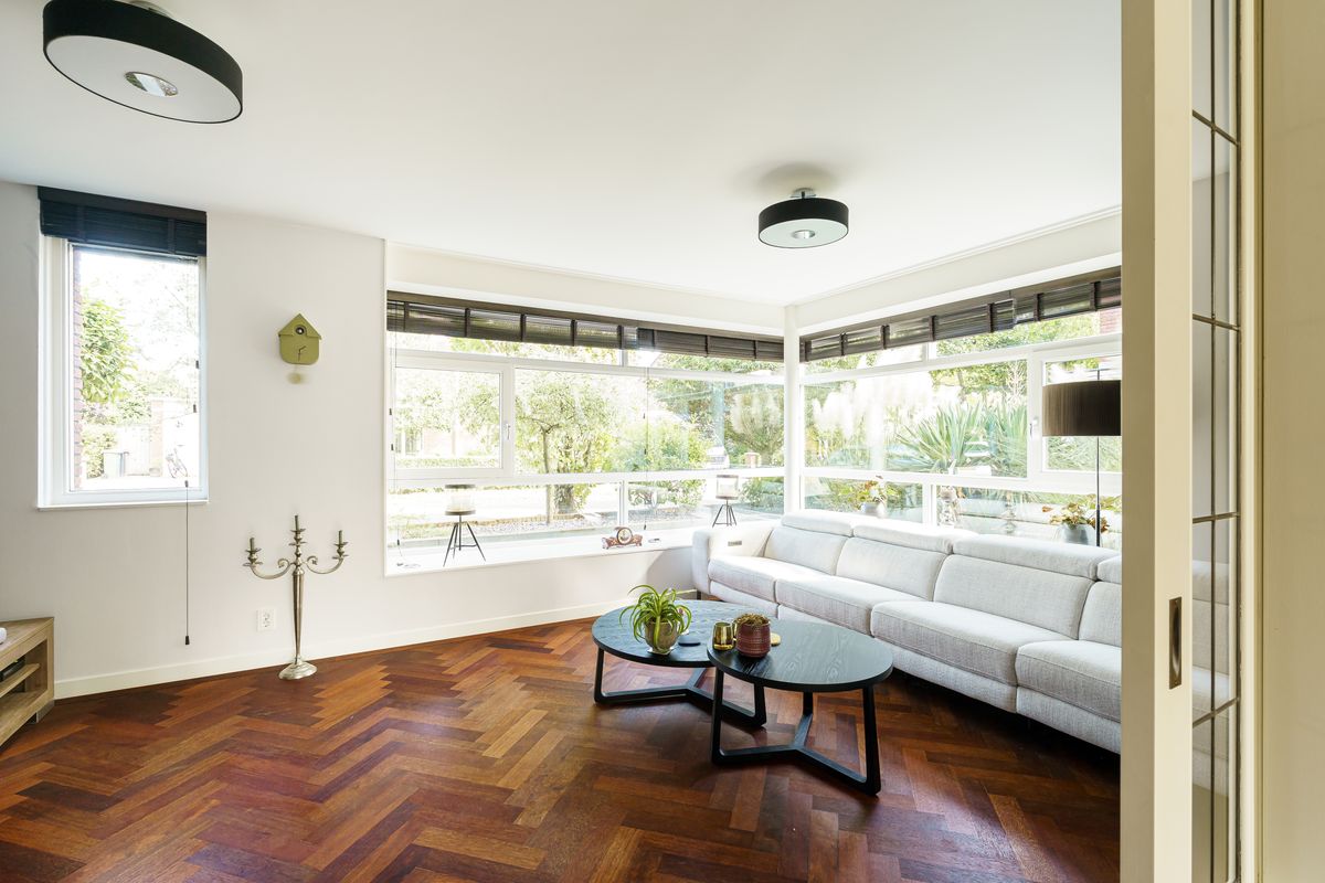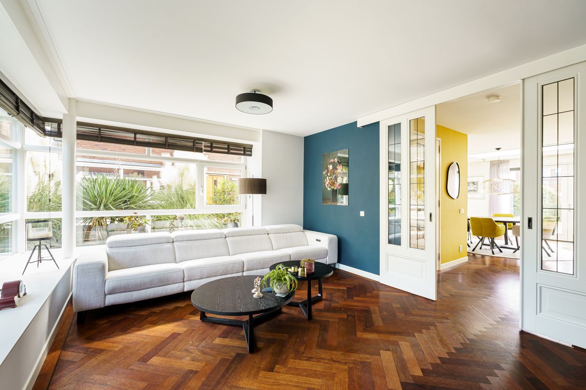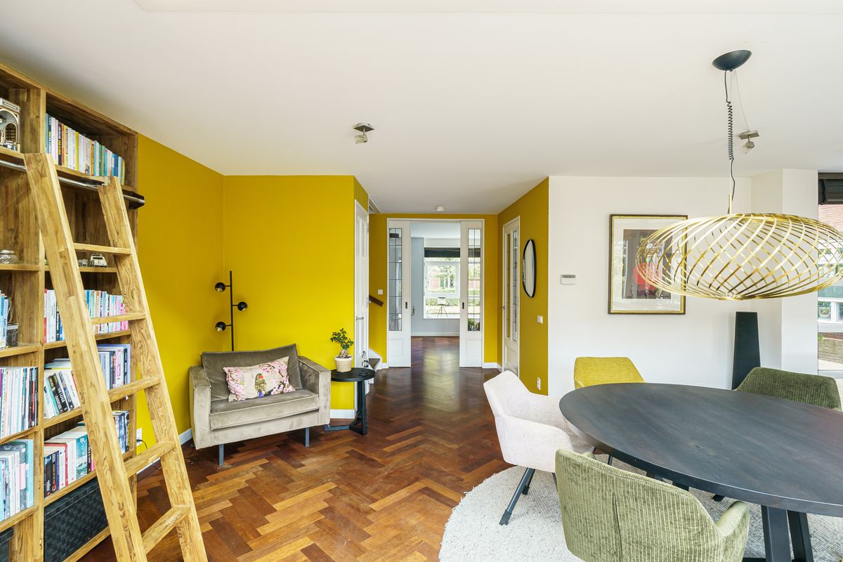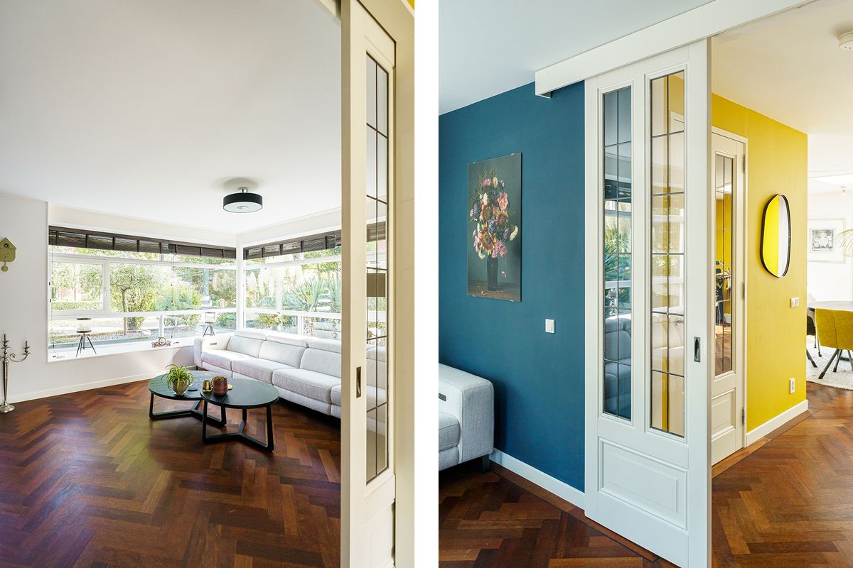 De entree bevindt zich aan de zijkant van het huis. Vanuit de hal met toilet kom je in de ruim opgezette leefruimte. De lichte woonkamer aan de voorzijde kan sfeervol worden afgesloten met fraaie schuifdeuren. Een verdiept raamkozijn rondom de hoek zorgt voor extra lichtinval en biedt een mooie plek voor je favoriete planten of accessoires.