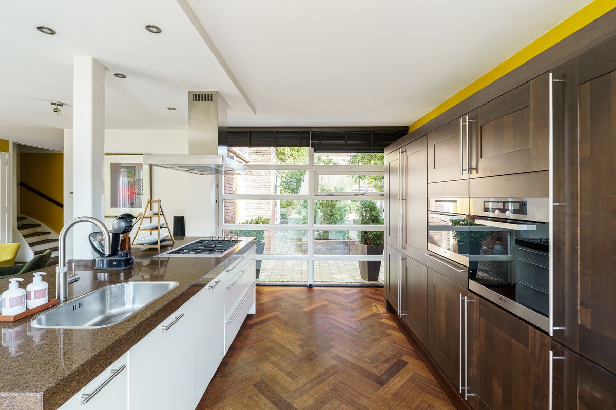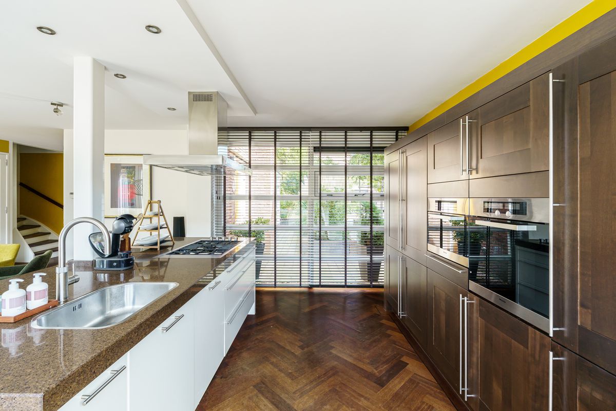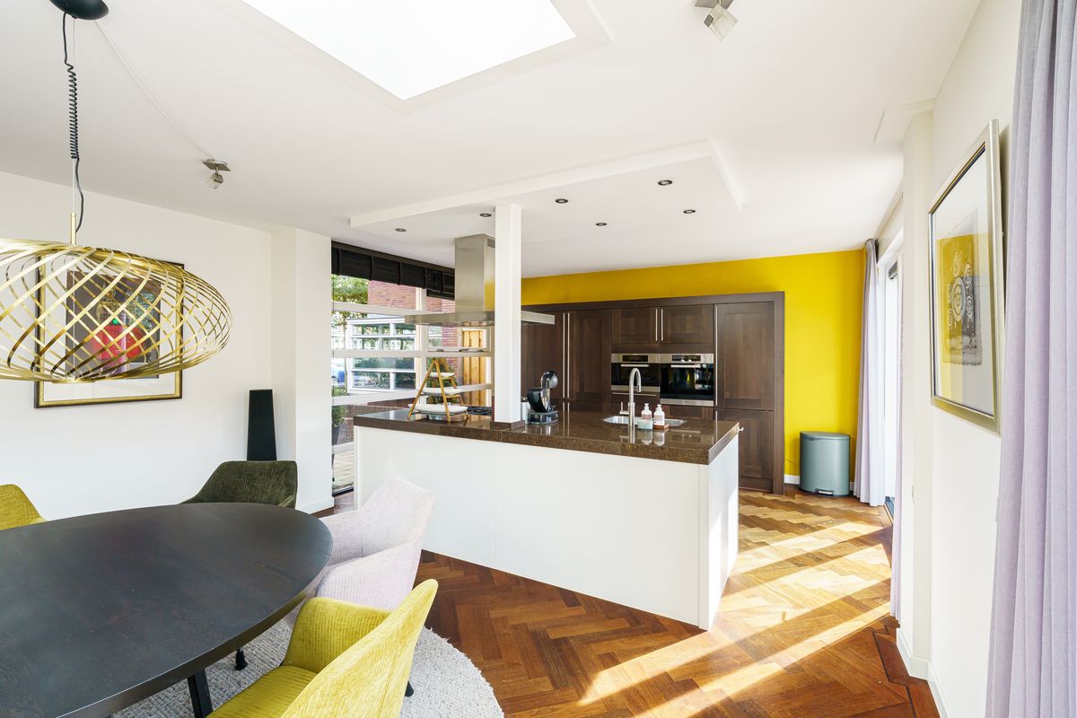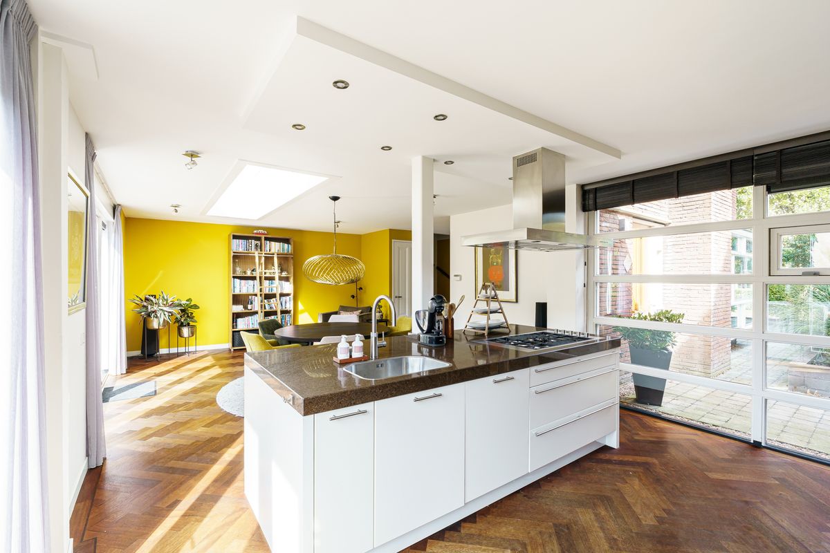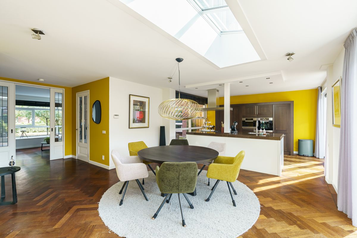 Aan de achterzijde bevindt zich de royale keuken, compleet met kookeiland, spoelbak en diverse inbouwapparatuur. Dankzij de grote raampartijen en lichtstraat in het dak baadt de hele ruimte in natuurlijk licht. Er is ook volop plek voor een grote eettafel, ideaal om te koken en tegelijkertijd contact te houden met je gasten of gezin. Vanuit de keuken stap je zo de achtertuin in, waar je kunt genieten van de zon dankzij de gunstige ligging op het zuidwesten. De tuin is fraai aangelegd met meerdere terrassen, groene hagen en borders met (fruit)bomen en struiken. Achterin vind je een praktische schuur en twee eigen parkeerplaatsen.