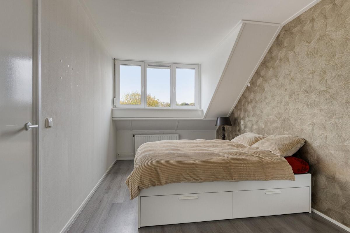 De zolderkamer is verrassend ruim en meet circa 14,70 m². Dankzij de dakkapel komt er veel daglicht binnen, en met het handmatig bedienbare rolluik houd je de kamer eenvoudig koel en donker wanneer je dat wilt. De kamer is netjes afgewerkt met een laminaatvloer en deels behangen, deels geschilderde wanden.