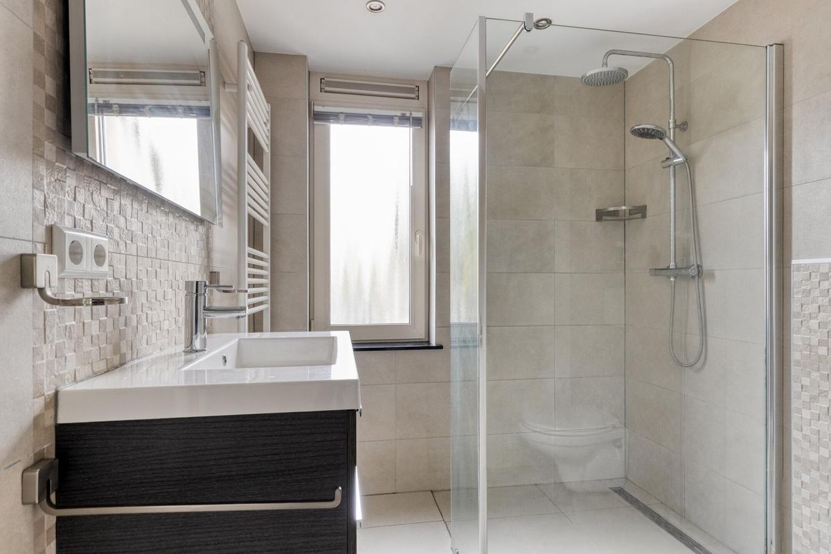 De badkamer is modern afgewerkt en uitgevoerd in een lichte kleurstelling met een combinatie van grote tegels en mozaïektegels. Dankzij het raam kun je natuurlijk ventileren, wat extra prettig is. Er hangt een designradiator om handdoeken te drogen, en de ruimte is voorzien van een inloopdouche met regendouche en handdouche, een zwevend toilet en een breed wastafelmeubel met spiegel. Het plafond is strak gestuukt en voorzien van inbouwspots. De badkamer meet circa 2,07 x 2,09 meter.