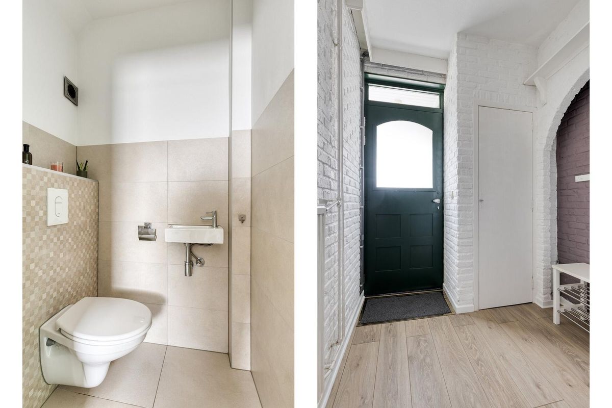 Via de voortuin kom je bij de entree van de woning. In de hal vind je direct aan de linkerkant de meterkast en een handige nis met ruimte voor schoenen en jassen. Daarnaast bevindt zich de trap naar boven en een modern toilet met hangend closet en fonteintje. De wanden in de hal zijn afgewerkt met geschilderd metselwerk en de lichte laminaatvloer ,gelegd in 2025, loopt door naar de woonkamer, waardoor het geheel een verzorgde en ruimtelijke indruk maakt.