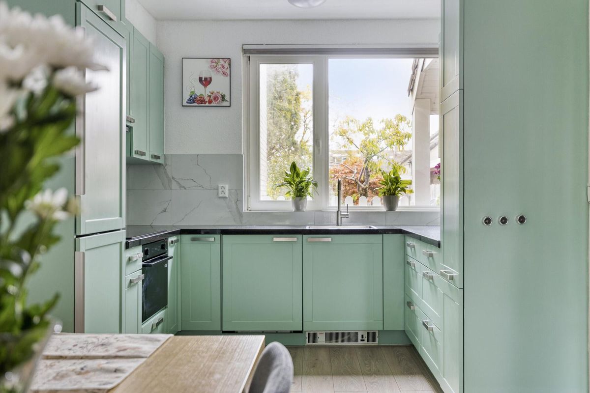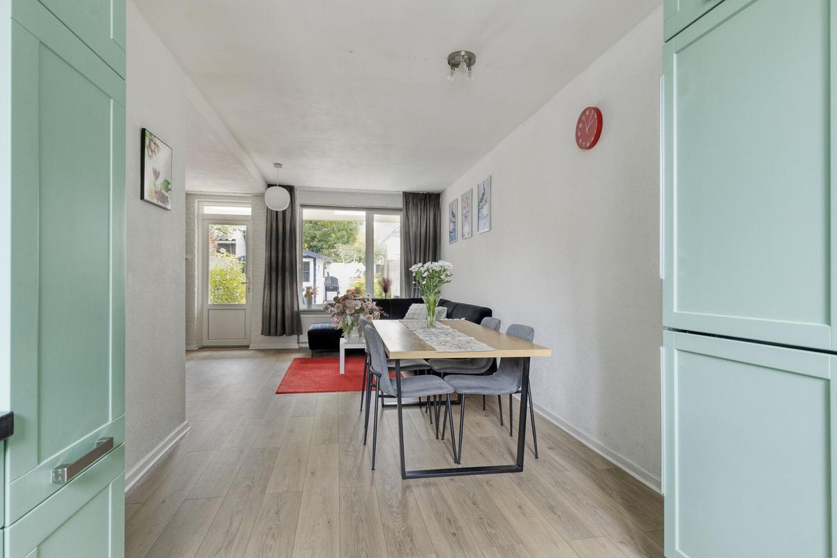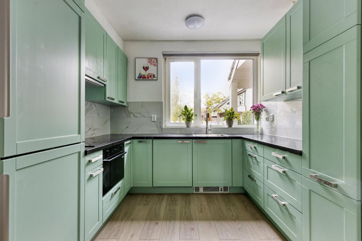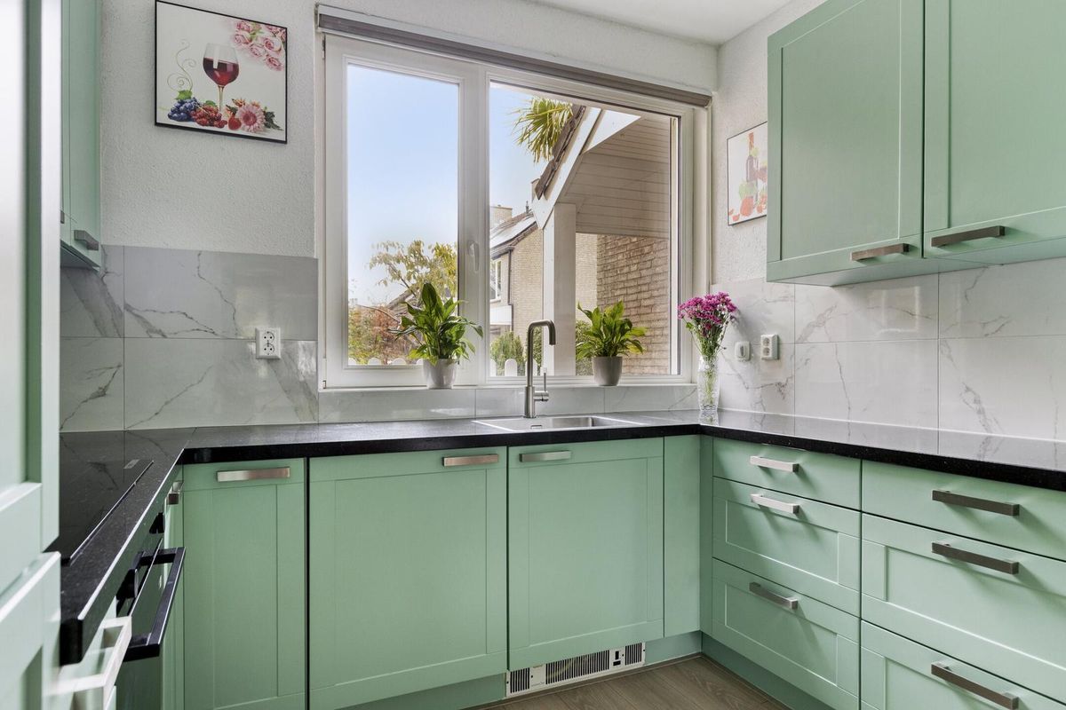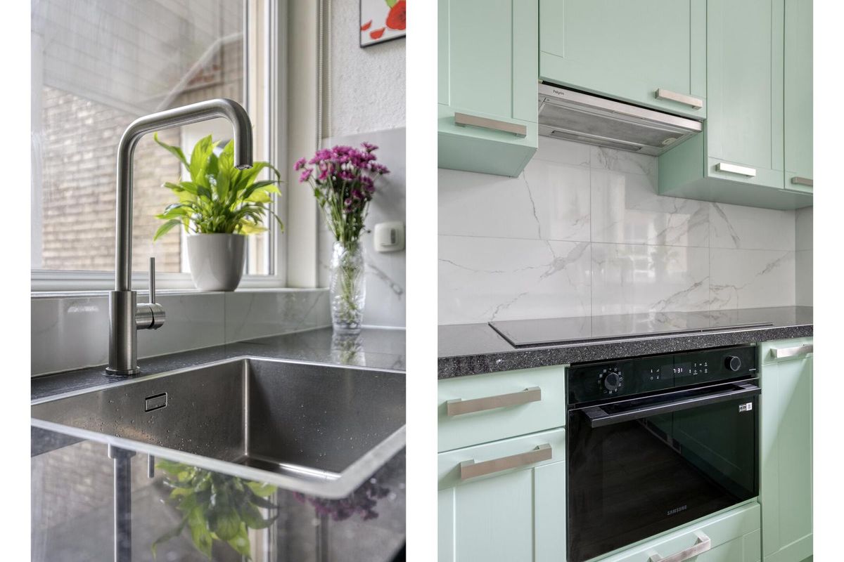 De keuken ligt aan de voorzijde van de woning en heeft een brede raampartij, zodat je tijdens het koken leuk contact houdt met wat er buiten gebeurt. De hoekopstelling biedt volop bergruimte in de hoge apothekerskast, lades en bovenkastjes. Qua apparatuur is alles aanwezig en in 2025 vernieuwd: een vaatwasser, een nieuwe combi-oven/magnetron, een extra brede inductiekookplaat met vijf kookzones, een koelkast en een vriezer.