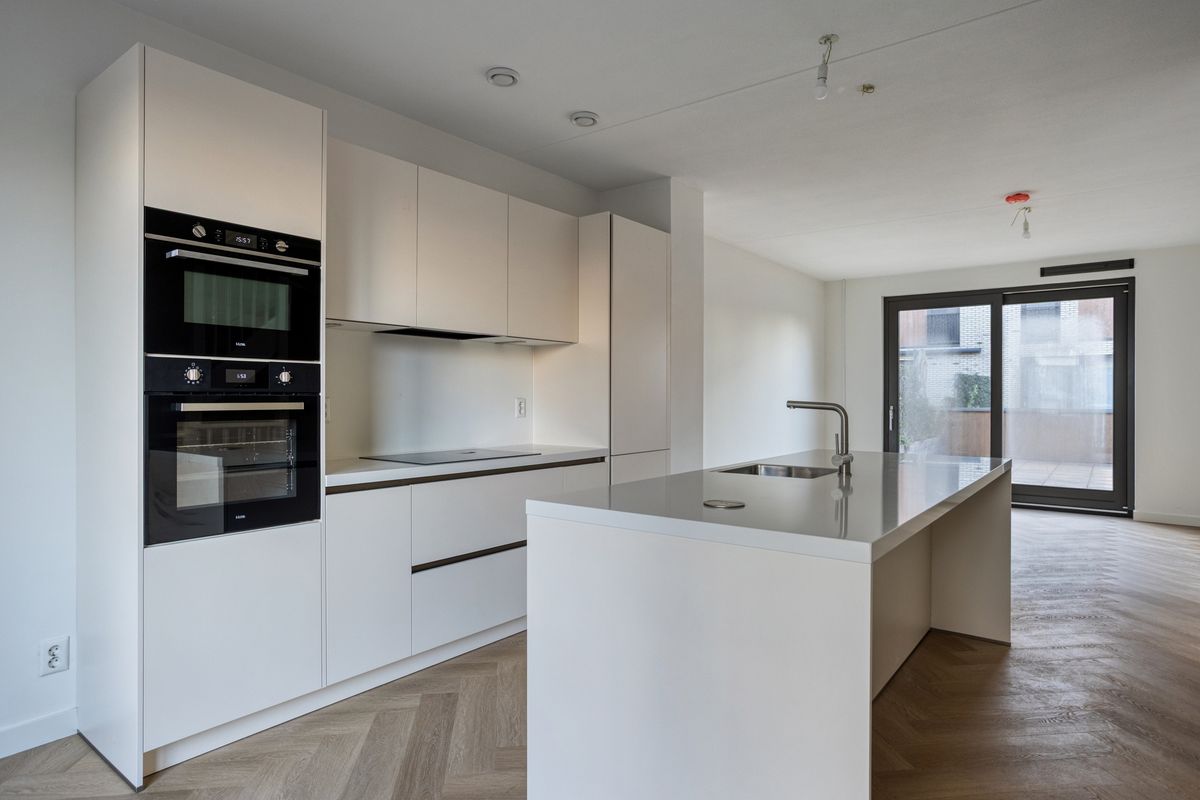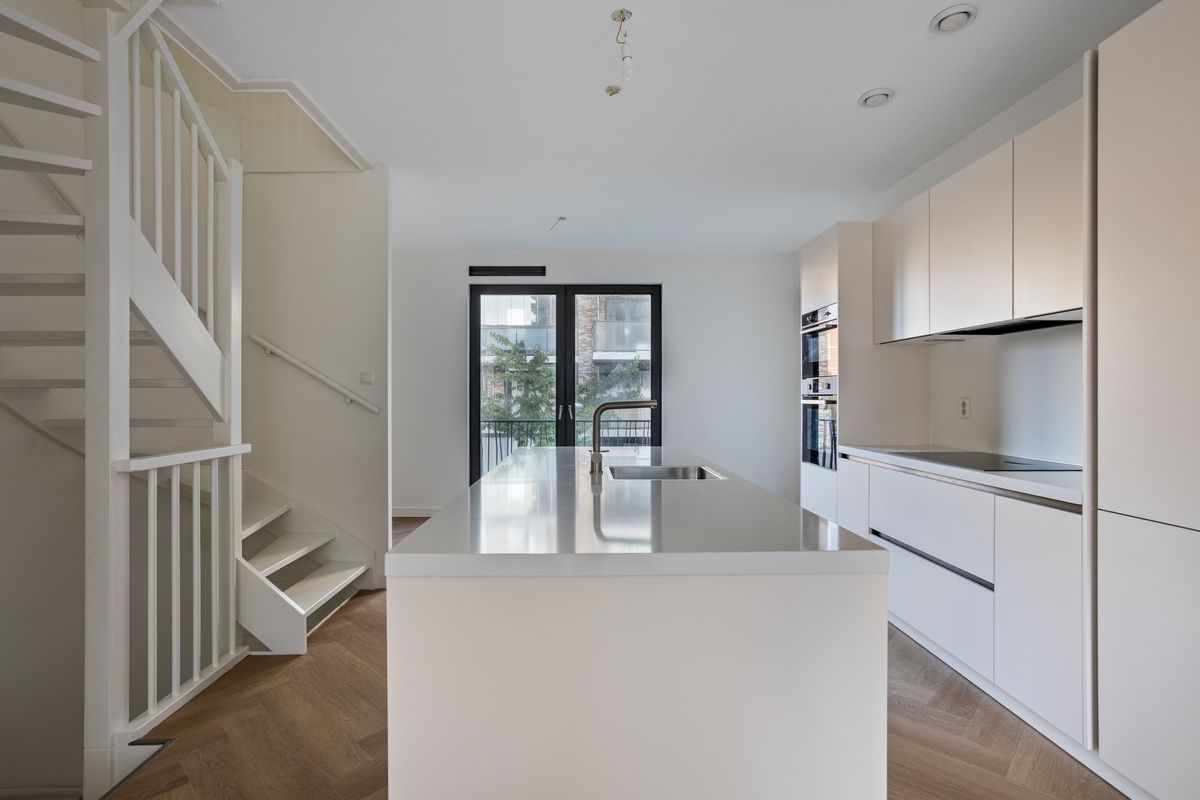 De royale woonkamer en open keuken bevinden zich op de eerste verdieping. Vanuit het zitgedeelte is er door middel van een grote schuifpui toegang tot het grote dakterras. Door de gunstige zonligging kan je hier heerlijk van het buitenleven genieten. De luxe open keuken is voorzien van een spoeleiland met een nieuw werkblad, een bar, magnetron, separate oven, inductie kookplaat, afzuigkap, vriezer met 3 laden, grote koelkast en een vaatwasser. Het eetgedeelte is voorzien van een Frans balkon met dubbele openslaande deuren.