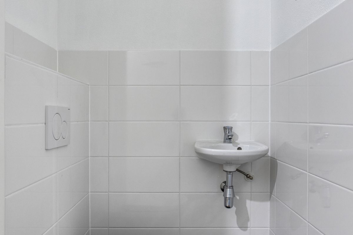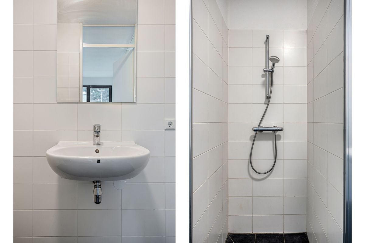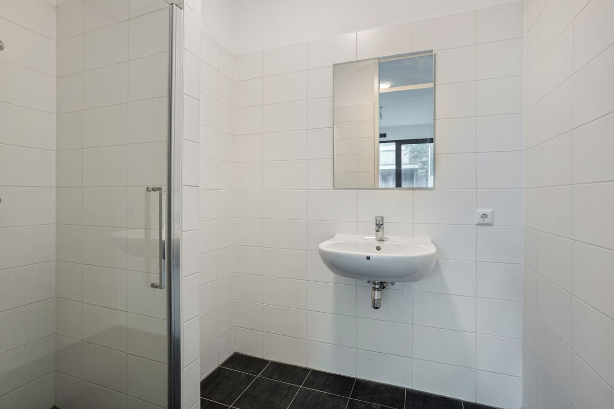 Eigen entree met toegang tot de hal met meterkast, trapkast en de trapopgang naar de eerste verdieping. Op de begane grond bevindt zich aan de voorzijde van de woning de eerste slaap-/werkkamer met badkamer. De badkamer is voorzien van douchecabine, wastafel, handdoekenradiator en vloerverwarming. Op deze verdieping is een separate toiletruimte aanwezig met een hangend toilet en een fonteintje. Aan de achterzijde van de woning bevindt zich de inpandige bergruimte met mechanische ventilatie unit, wasmachine aansluiting en opstelmogelijkheid voor de wasdroger.