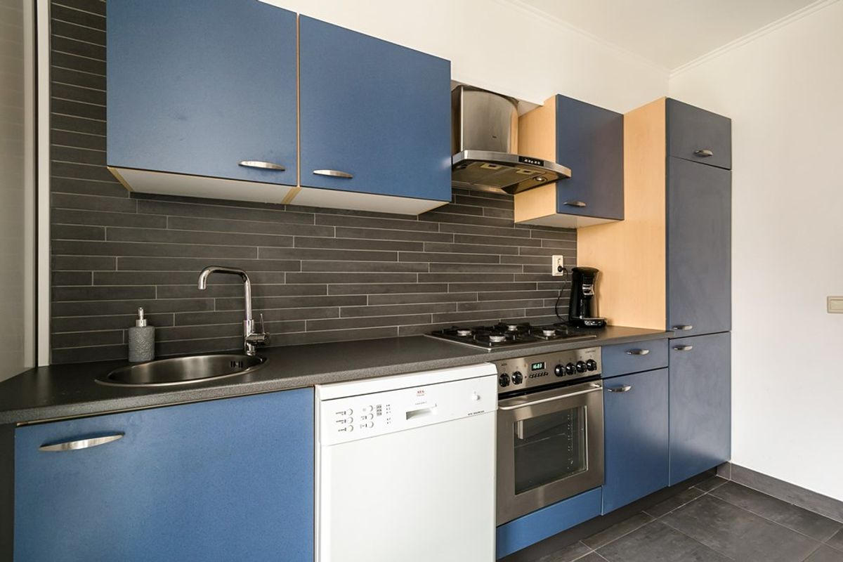 gaskookplaat, oven, koelkast, vaatwasser en afzuiging.