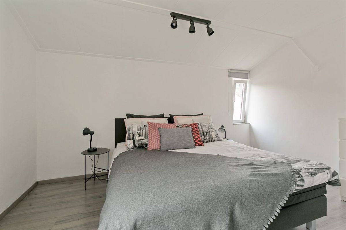 Ruime slaapkamer met laminaatvloer, vanuit de slaapkamer toegang naar de