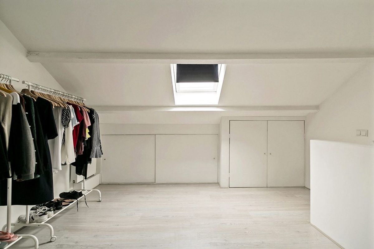 Middels vaste trap bereikbare zolderkamer met dakraam, laminaatvloer,