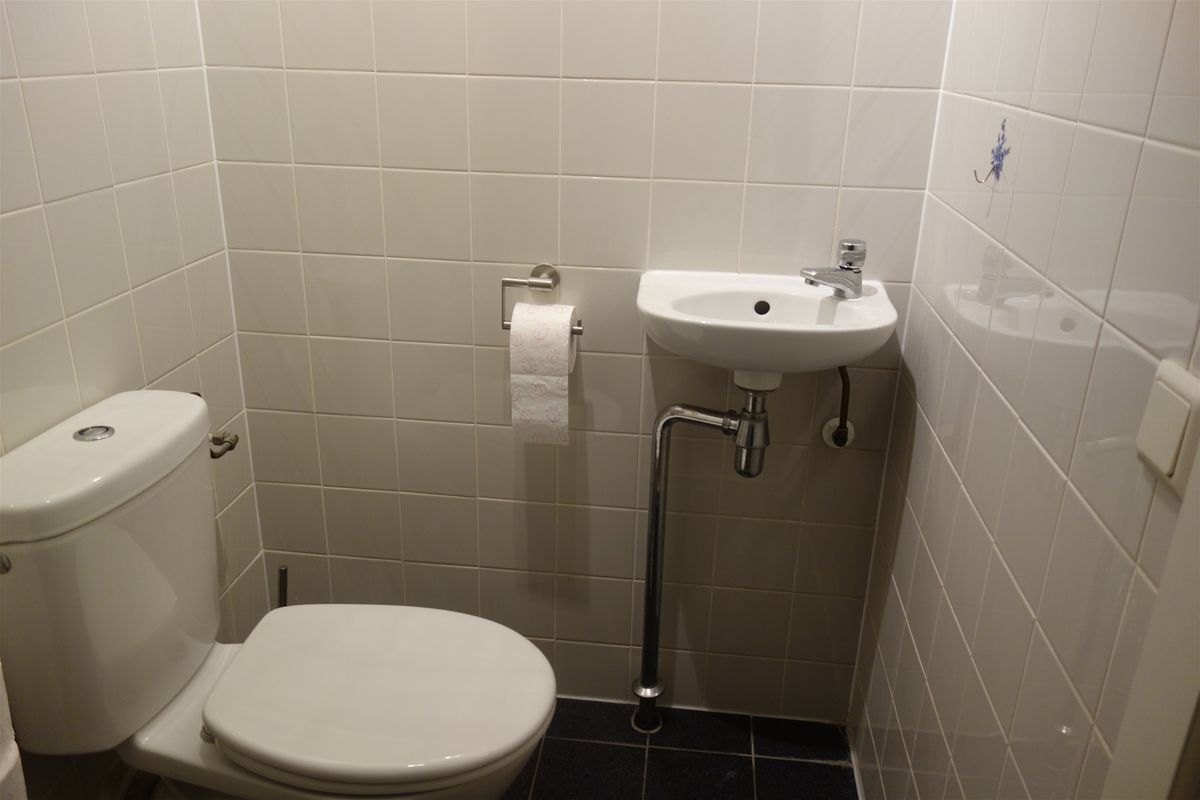 Luxe uitgevoerd, volledig betegeld toilet in lichte kleurstelling met donkere vloertegel en voorzien van toilet, fontein en mechanische ventilatie.