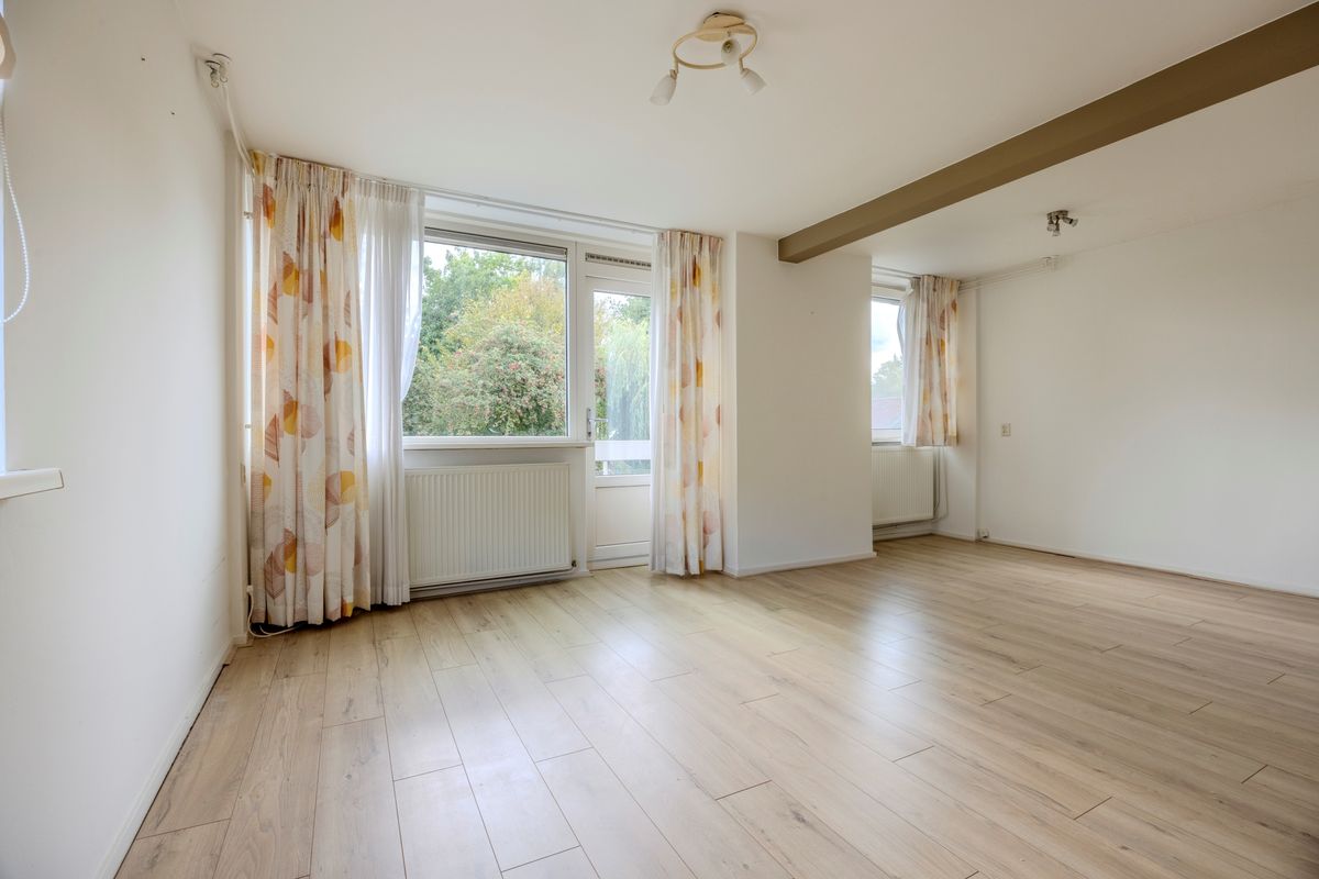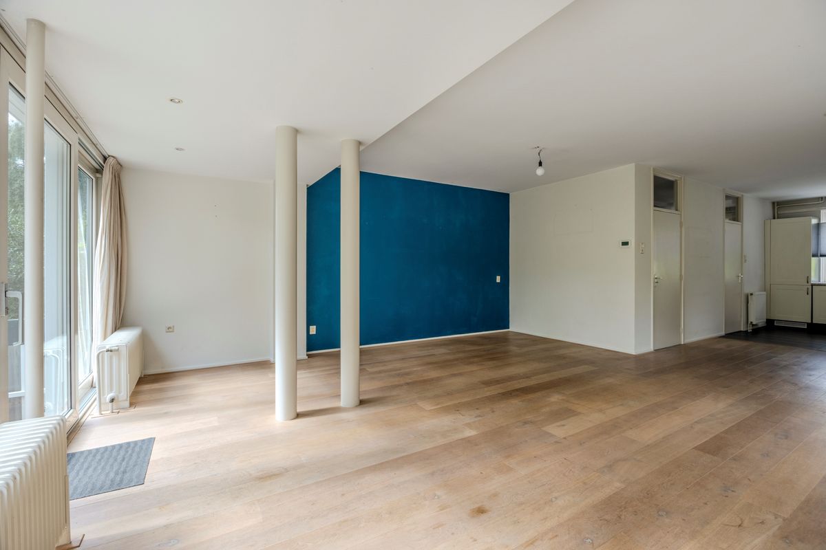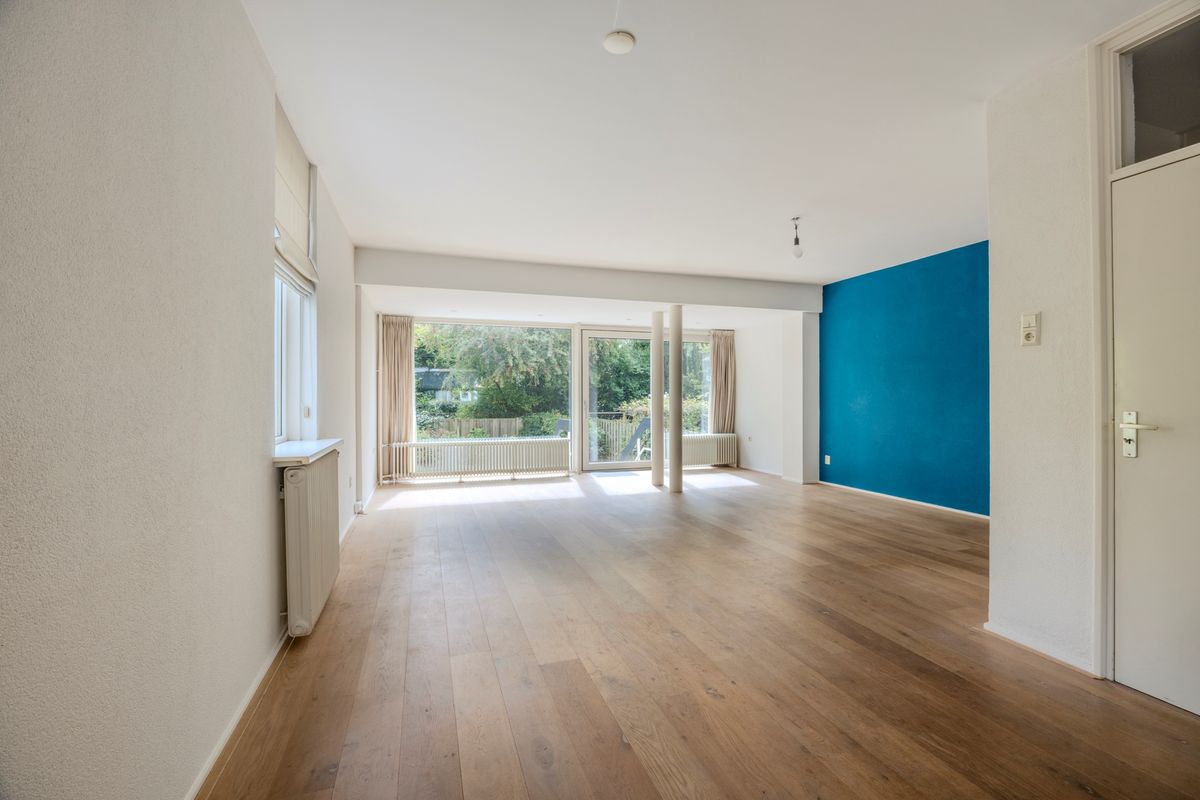 • Uitgebouwde woonkamer met parketvloer, grote raampartij en schuifpui naar de tuin.