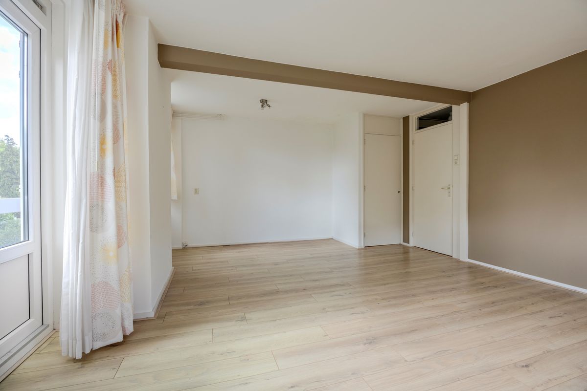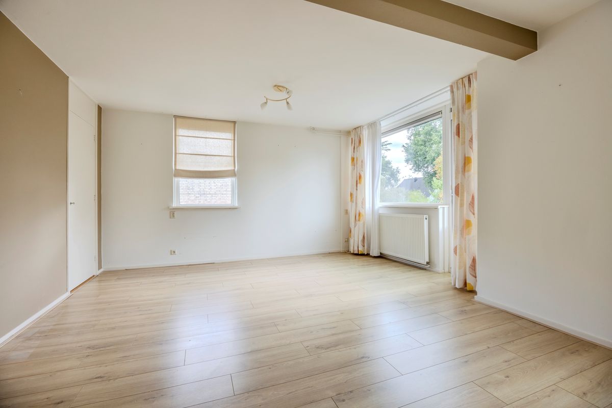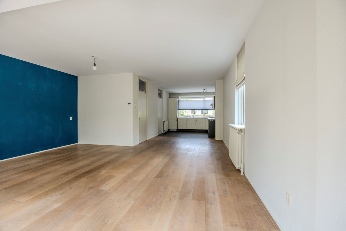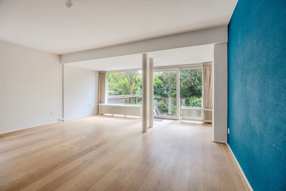 • Uitgebouwde woonkamer met parketvloer, grote raampartij en schuifpui naar de tuin.