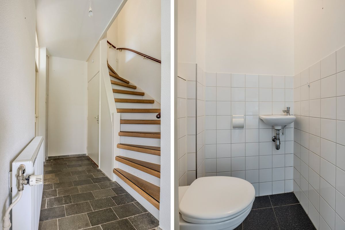 Trap naar het bordes met entree, hal met toilet, trapkast en trapopgang.