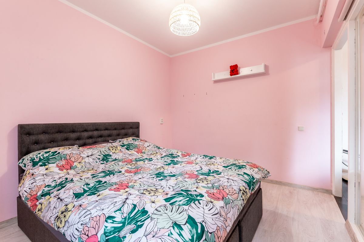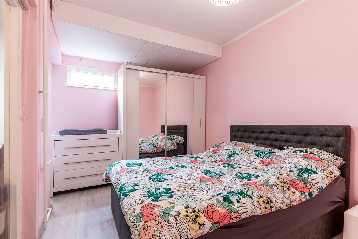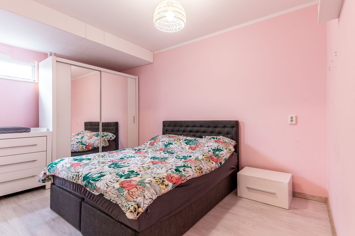 De woonkamer is tuingericht en dankzij de brede ramen valt het daglicht hier prettig naar binnen. Een schuifdeur brengt je naar de slaapkamer, die verrassend royaal is en bovendien een eigen deur naar de tuin heeft.