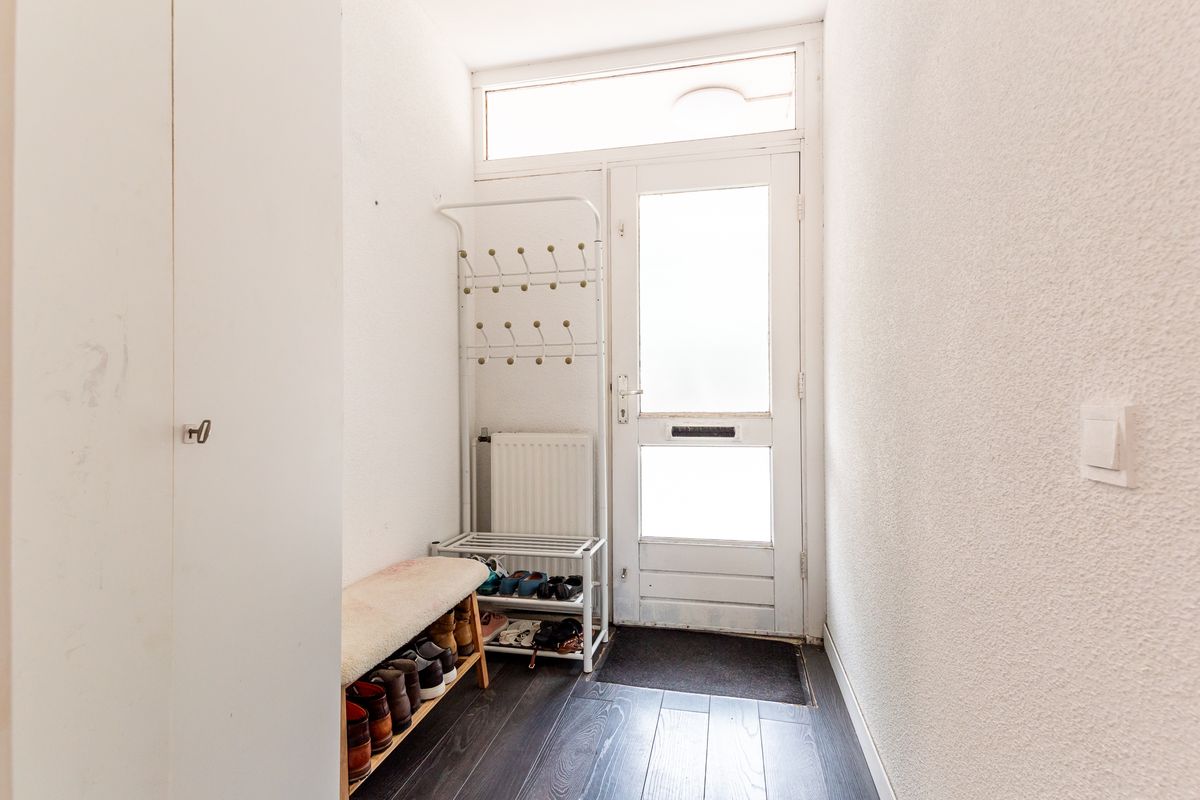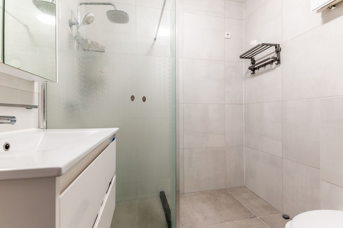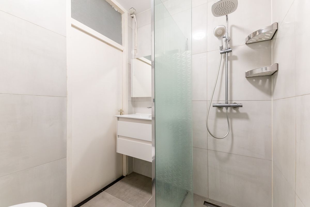 Via een halletje in de woonkamer bereik je de bergruimte met de cv-installatie en de badkamer. De badkamer is compact, met douche, wastafel. Hier vind je ook het toilet.