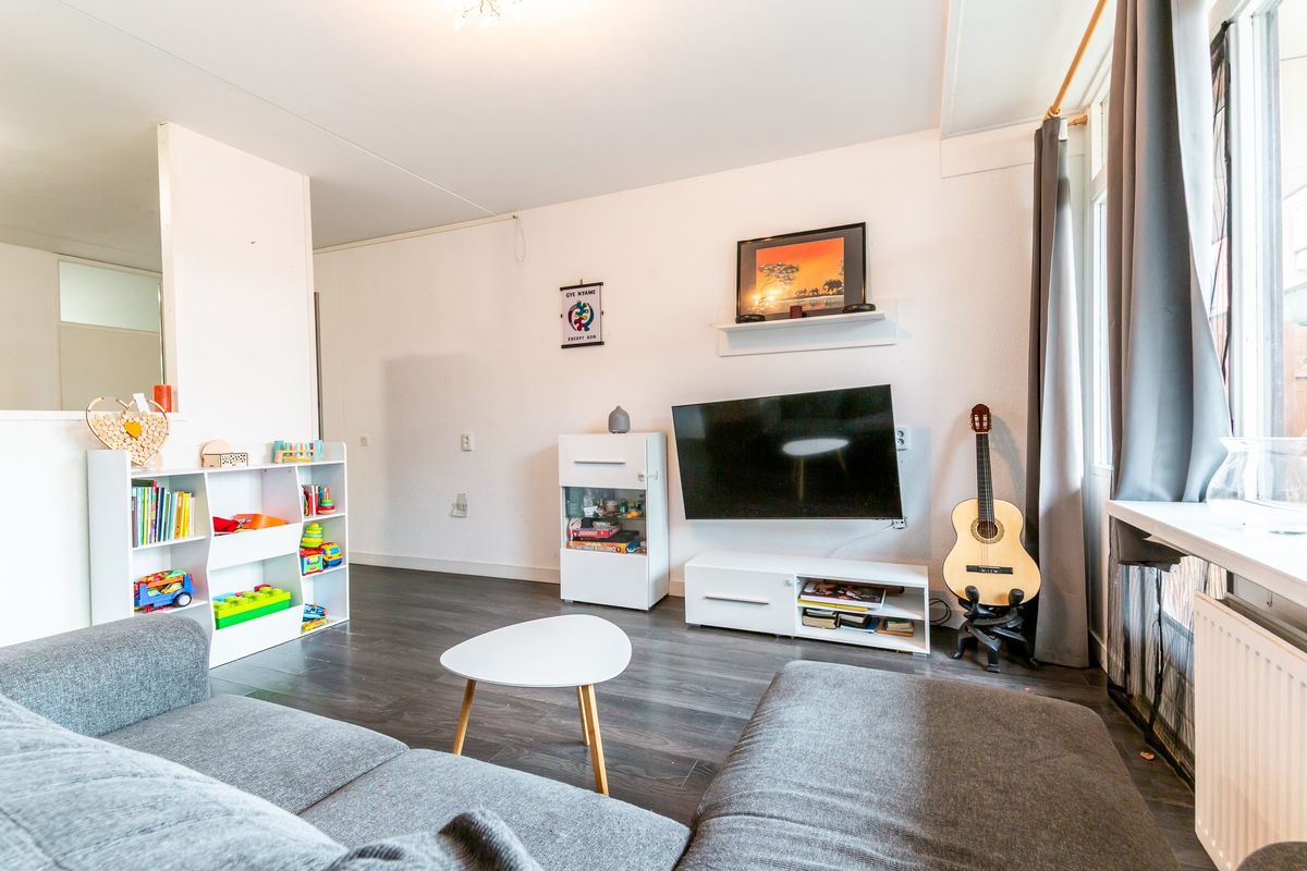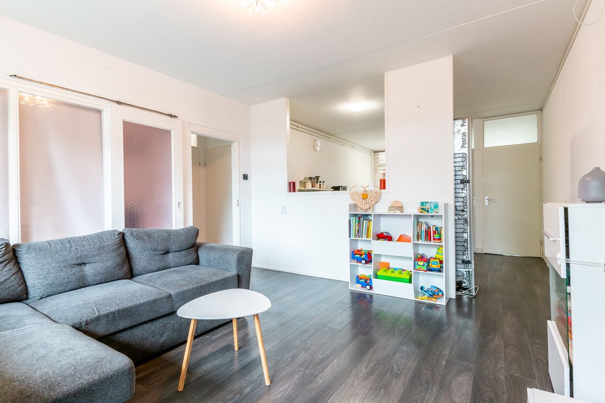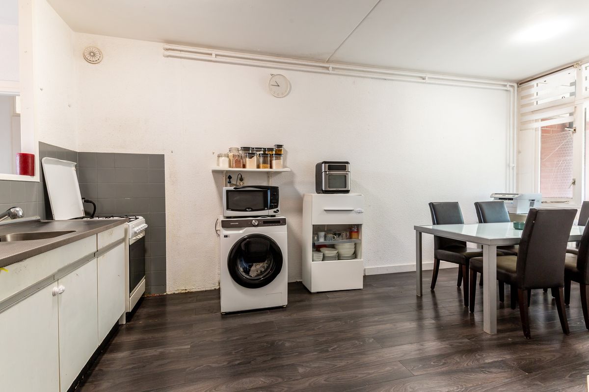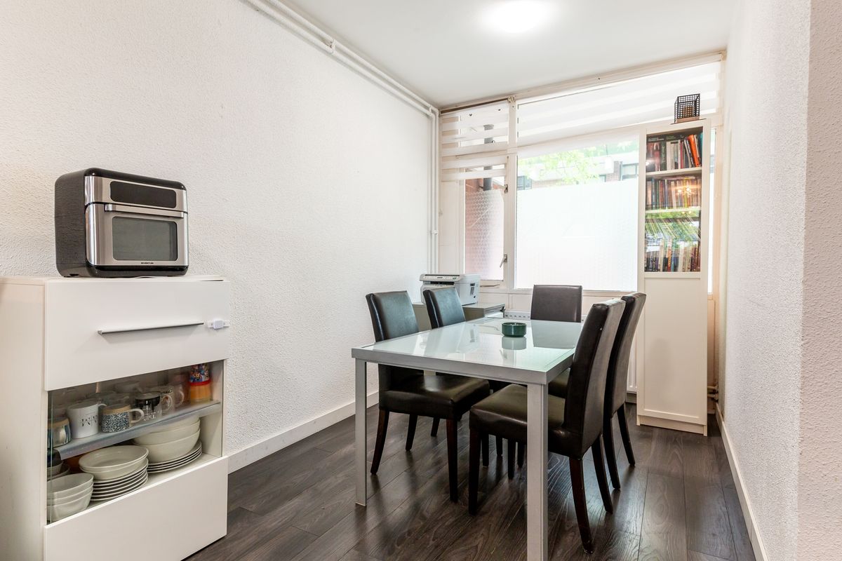 Vanuit de entree stap je de eetkamer binnen, aan de voorzijde van het appartement. Hier vind je ruimte voor een eettafel en biedt het raam aan de straatzijde zicht op de wijk. De open keuken ligt centraal en vormt nu de scheiding tussen eetkamer en woonkamer. Vanuit de keuken heb je een doorkijkje naar de living.