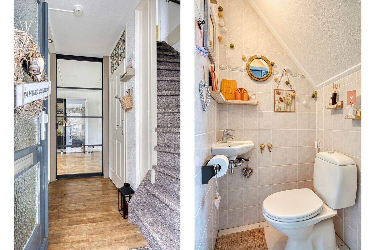 Via de voordeur heeft u toegang tot de woning. De entree biedt plaats aan het toilet, vaste trapopgang naar de 1e verdieping en een praktische schuifwandenkast waarin zich de meterkast (11 groepen + 4 aardlekschakelaars) bevindt. Middels een chique stalen schuifdeur heeft u toegang tot de woonkamer. De gehele begane grond is voorzien van vloerverwarming en is afgewerkt met een PVC vloer.