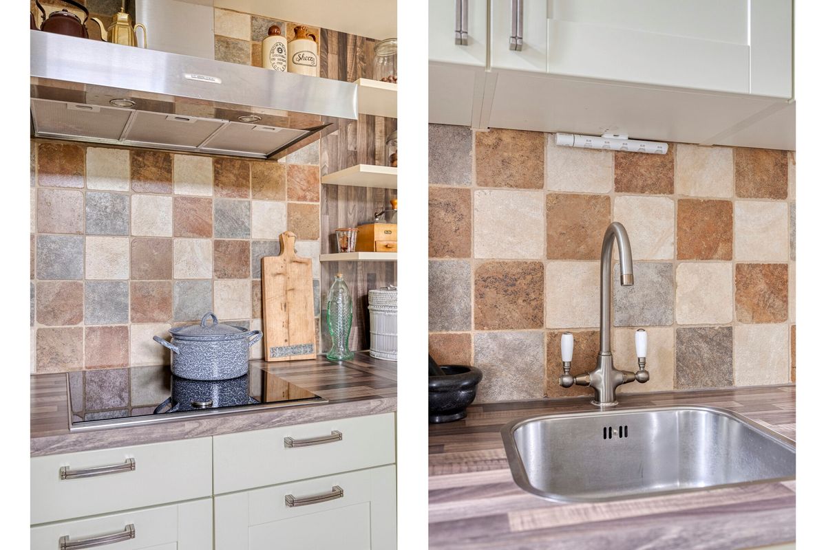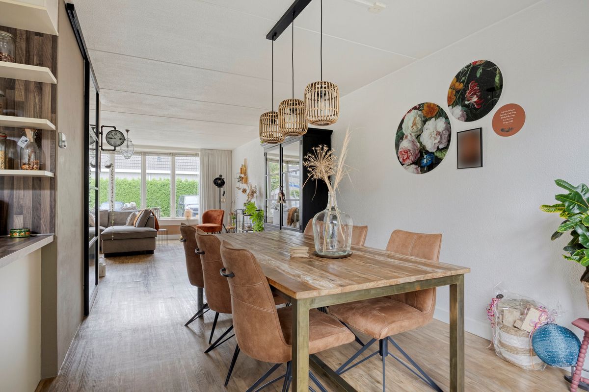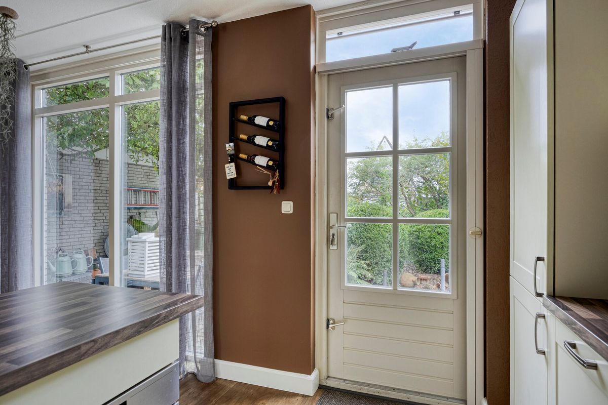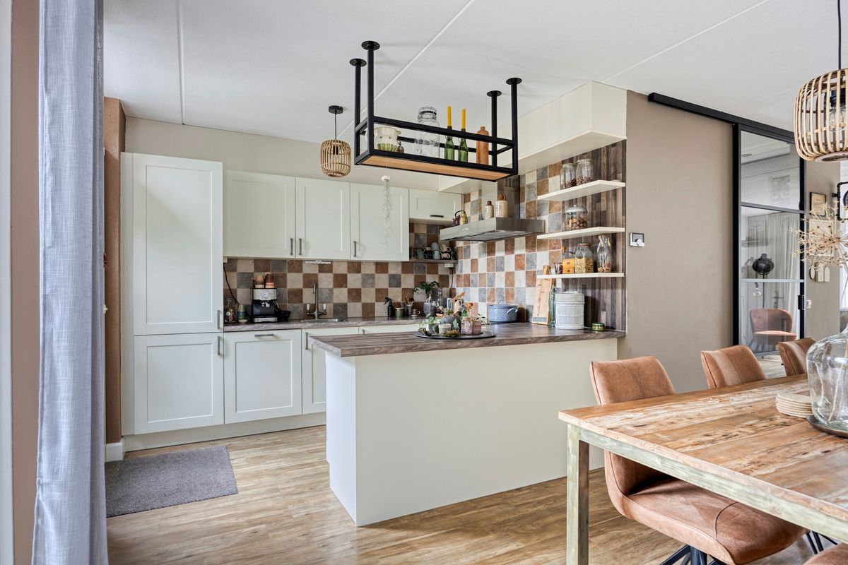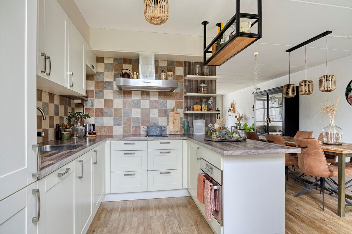 De luxe open keuken aan de achterzijde in U-opstelling is voorzien van een kunststof aanrechtblad met betegelde achterwand en beschikt over diverse inbouwapparatuur, te weten; koel/vries combinatie, vaatwasser, combi-oven, inductiekookplaat, afzuigschouw en close-in-boiler. Vanuit de keuken heeft u direct toegang naar de achtertuin.