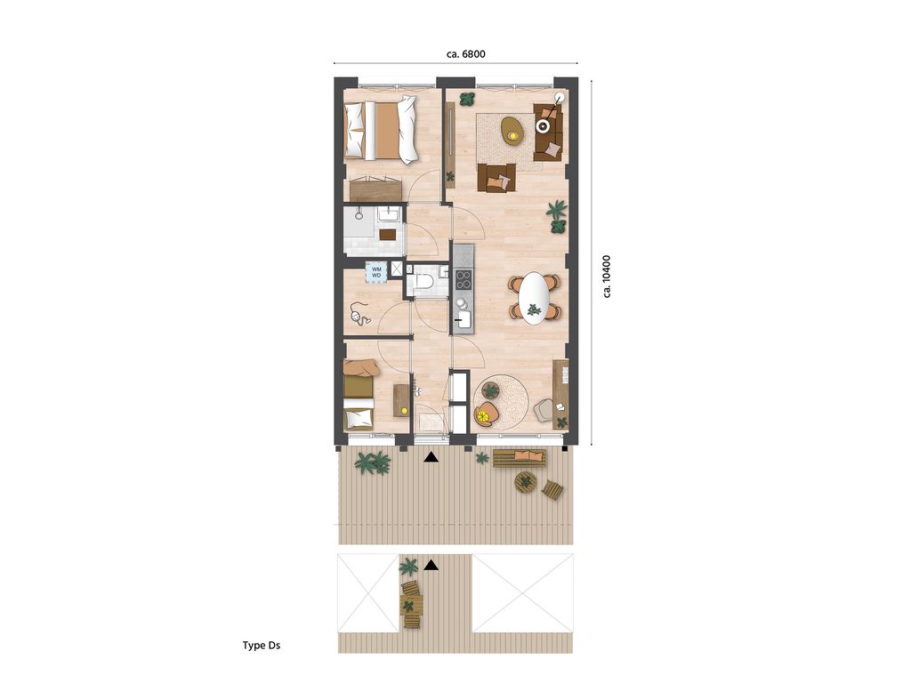 Timber biedt een gevarieerd aanbod van compacte 2- en 3-kamerappartementen van ca. 55-81m2. Elk type is voorzien van een eigen buitenruimte in de vorm van een loggia of terras.