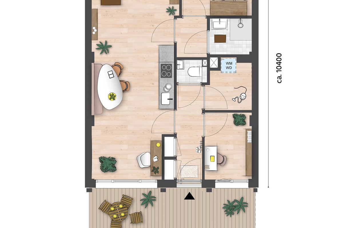 Timber biedt een gevarieerd aanbod van compacte 2- en 3-kamerappartementen van ca. 55-81m2. Elk type is voorzien van een eigen buitenruimte in de vorm van een loggia of terras.